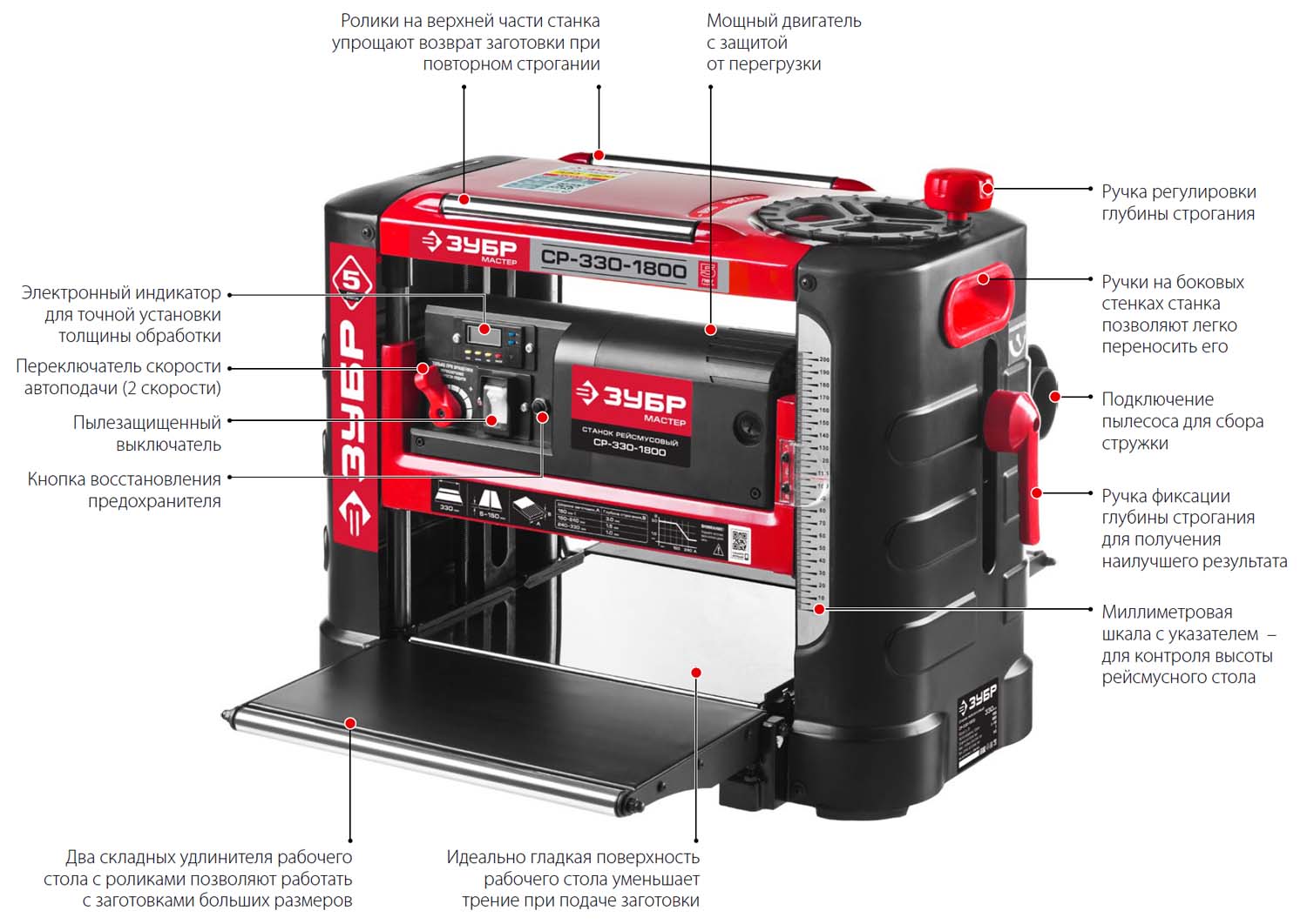 Реймусный настільний верстат Зубр СР-330-1800 служит для строгания і столярной обробки заготовок из древесины в предварительно заданные розміри по высоте з помощью вращающихся ножей.