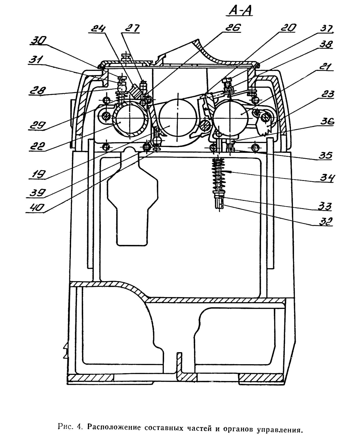 Передний прижим — секционный. Прижимная губка переднего прижима состоит из узких секций. Давление каждой секции осуществляется пружиной 3. Все секции размещаются на оси 4.