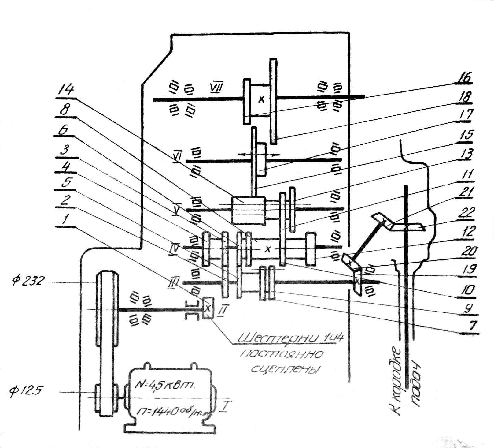Кінематична схема фрезерного верстата Дзержинец ТГ-2. Дивитись у збільшеному масштабі