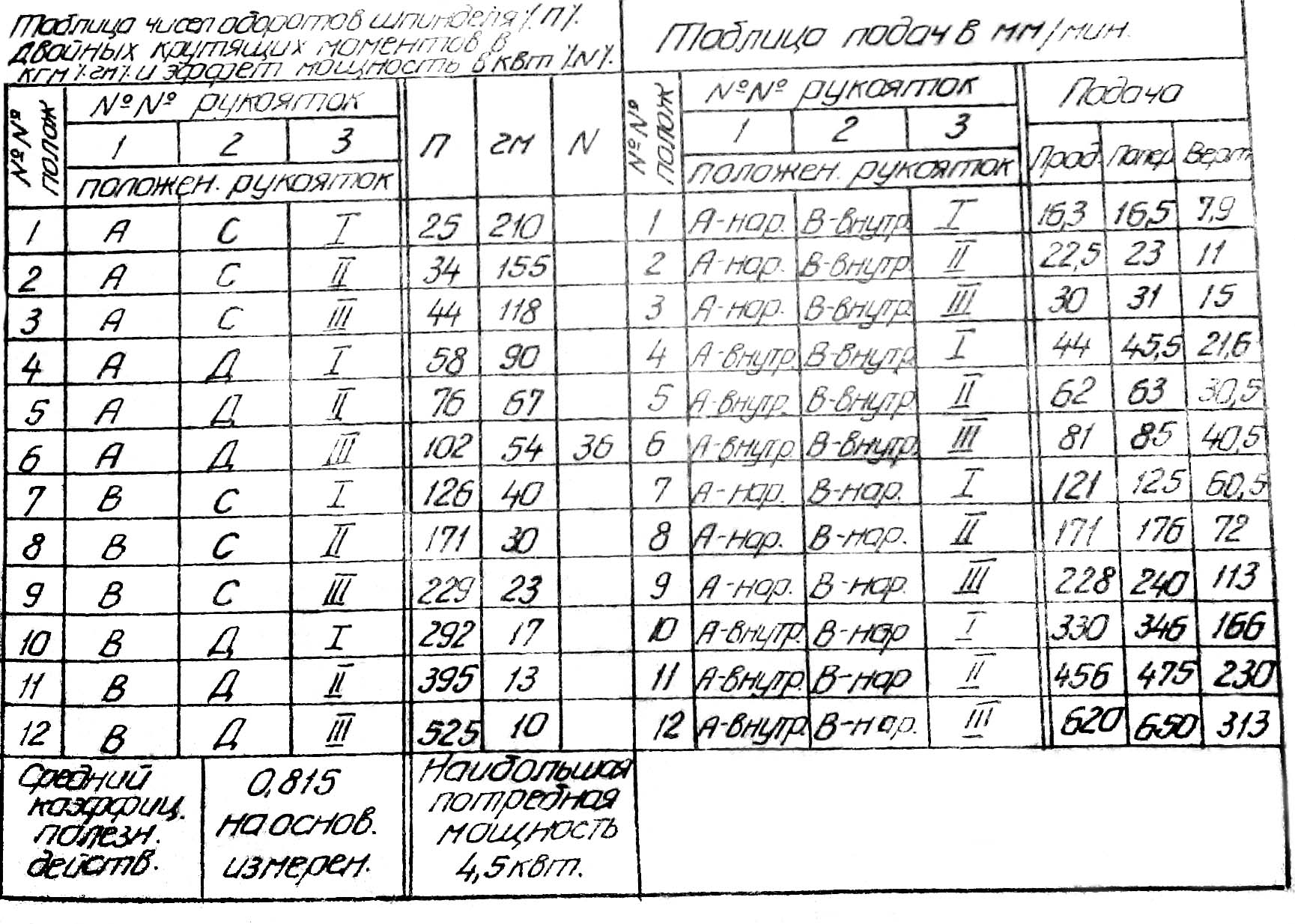 Таблиця оборотів і подач Дзержинец ТГ-2 cтанок горизонтальный консольно-фрезерный