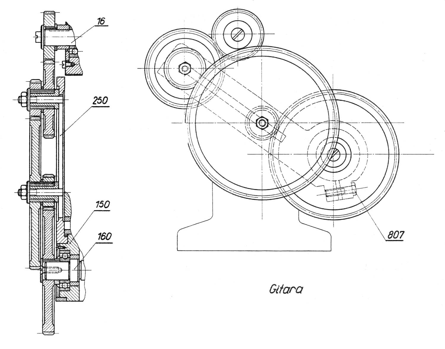Гітара укріплена на цапфі валика 160, обложеного корпусі коробки подач 150.