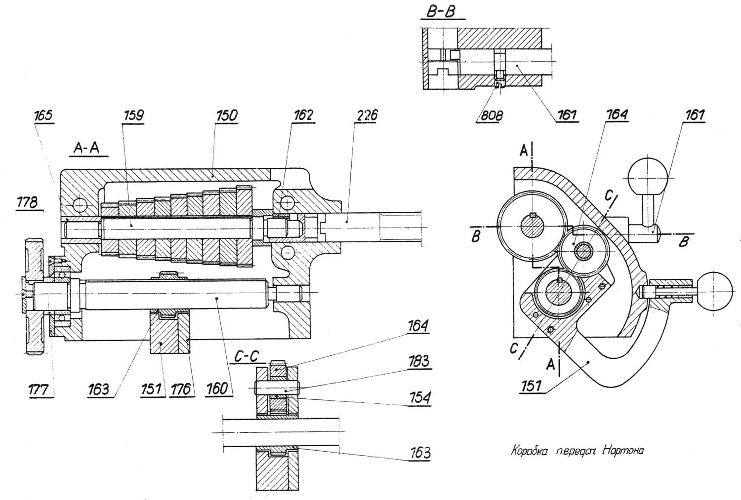 Від валика коробки подач 160 отримує обертання за допомогою гітари шпинделя, обертання переноситься через зубчасте колесо 163 на проміжне колесо 164, що знаходиться в пересувному важелі 151 і на одне із зубчастиних коліс в системі Нортона 9 Коробка подач під час точення дає 9 різьблення подач залежно від зубчастиних коліс на гітарі. Для нарізки різьблення застосовується гітара із комплектом змінних зубчастиних коліс.