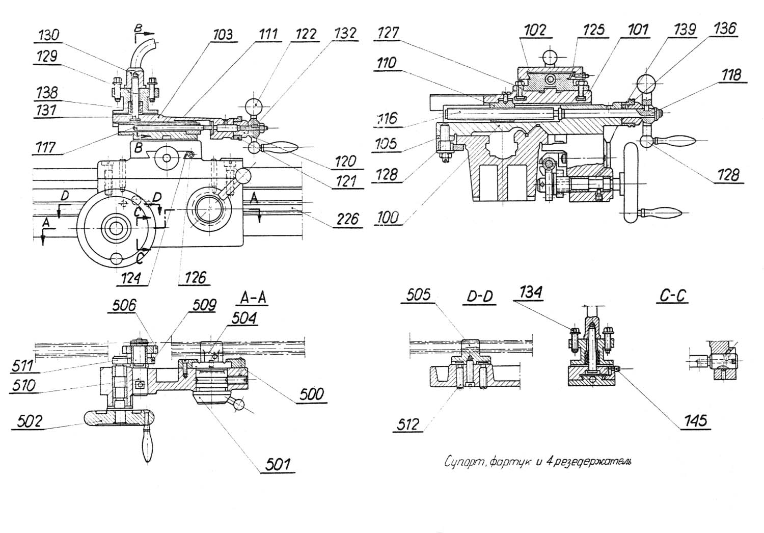 Супортна плита із укріпленим у ній фартухом переміщається по двох зовнішніх - призматичній та плоскій напрямній. Поздовжній рух по станині отримуємо від ходового ггвинта 226. Нижній супорт 101 укріплений на супортній плиті 100 отримує поперечне переміщення по відношенню напрямку руху супортної плити, за допомогою ходового ггвинта 116 обертанням рукоятки 123. Поворот 102 осажден на нижній суппорта про закріплену на ньому резцедержавку 129 зі свавільним кутом від 0° до 60° у двох кутових напрямках для точення коротких конусів. Під час точення конусів переміщення верхнього супорта обложеного по направляючих повороту 102 отримуємо за допомогою ходового ггвинта 117 через покручування маховичком 122, прикріпленого на її вільному кінці включенням ходового ггвинта 226.