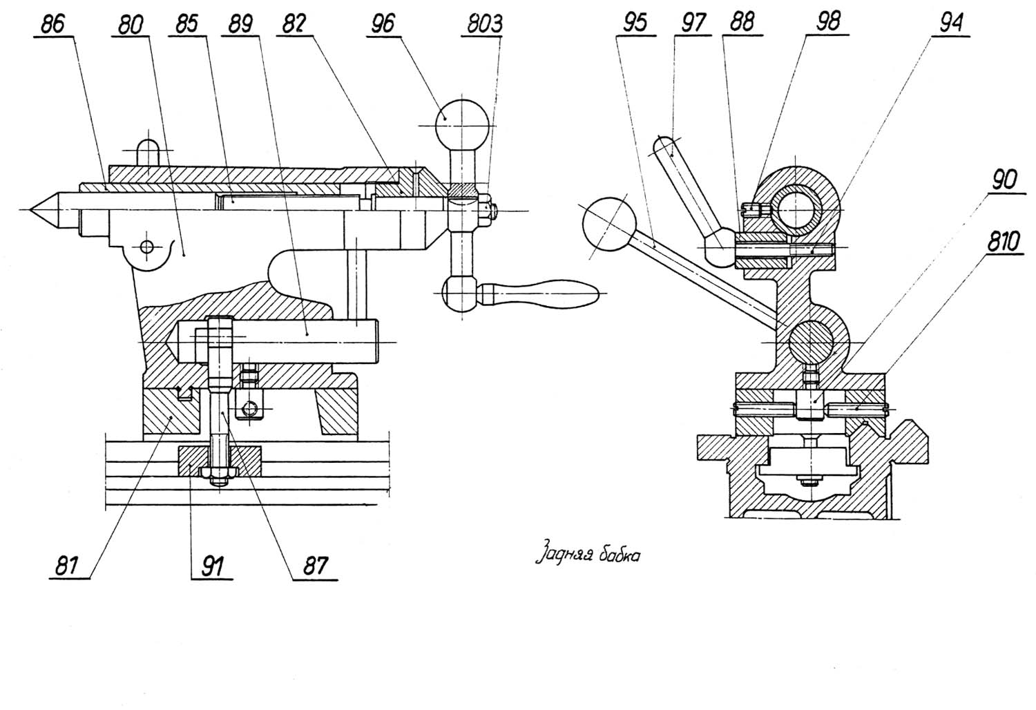 Перепендикулярність переміщення задньої бабки забезпечена направляючим виступом в пазі плитки 81. Задню бабку зміцнюємо до призмів за допомогою плитки 91 підтриманої нижніми краями направляючих станини, натискається регульованою тягою 87 взаємодіє з ексцентриковим валиком 89, осадженим у корпусі 9 Переміщення корпусу задньої бабки у напрямку від осі шпинделя отримуємо ггвинтами 810, обложеними у гвинті 81 і діють на шкворень 90, загвинчений корпус задньої бабки. У корпусі задньої бабки обложено пересувну гільзу 86 з внутрішнім конусом Морзе № I для центру. Переміщення гільзи отримуємо шляхом повороту ходового ггвинта 85 рукояткою 96. Нерухоме положення висунутої гільзи забезпечує затискна втулка 88, що натискається рукояткою 97 обложеної на гвинті 94, загвинченим корпус задньої бабки. Захищає втулку перед обертанням під час переміщення гвинт 98, який своїм кінцем по фрезеровану поздовжню канавку на гільзі. Для висування центру з гнізда гільзи всовуємо її в корпус задньої бабки шляхом обертання ходового ггвинта, який виціснить свій кінцем центр з конуса.