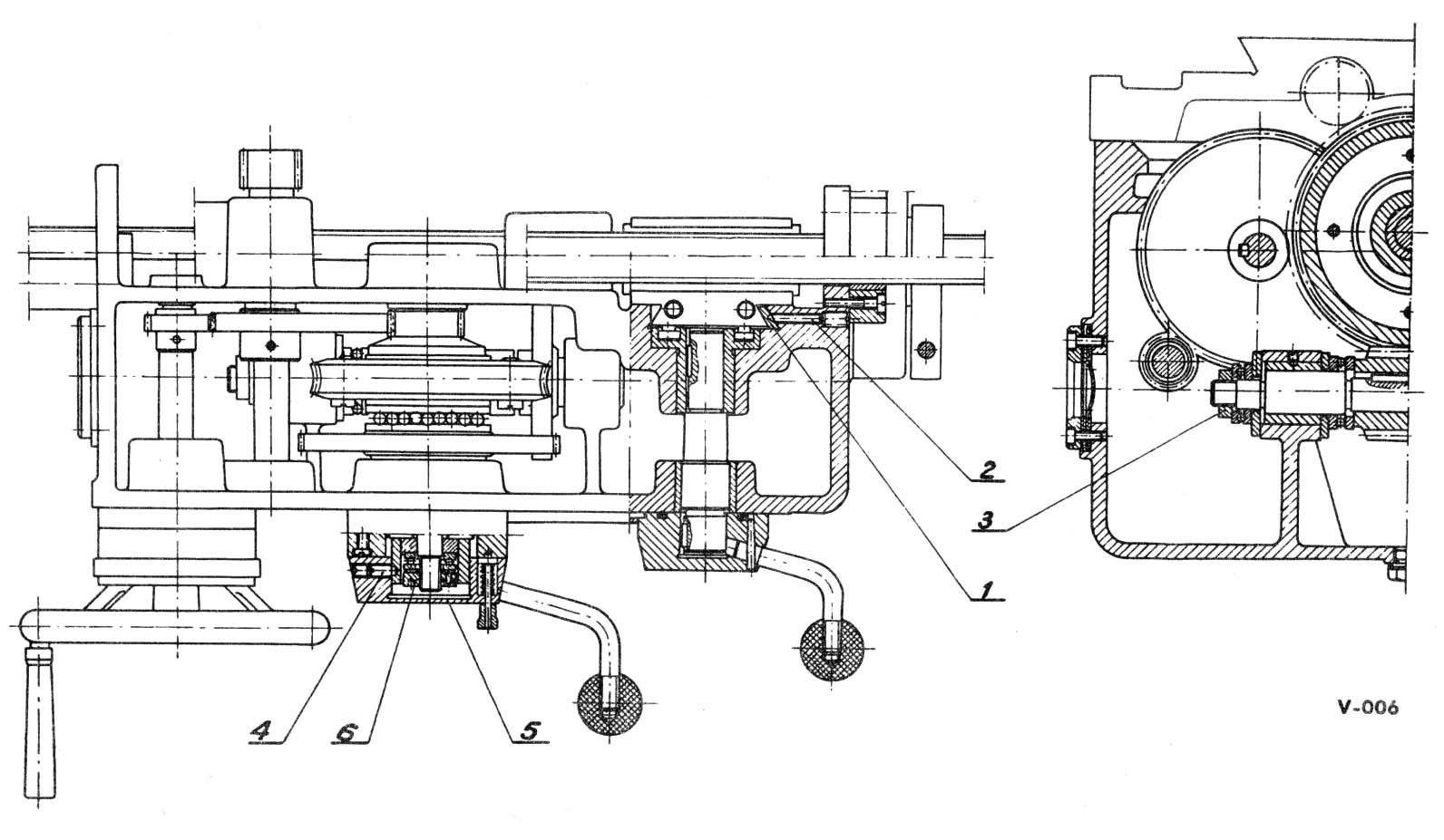 Крім того, слід перевірити дію запобіжної муфти (схема № V-004). Для цього замість маховичка ручної подачі супорта слід закріпити барабан діаметром 200 мм із намотаним сталевим канатом, який навантажується гирями вагою 12 кг. Потім встановлюється подача р = 0,508 мм (для метричної системи), а також кількість обертів n = 45 об/хв і верстат пускається в хід.