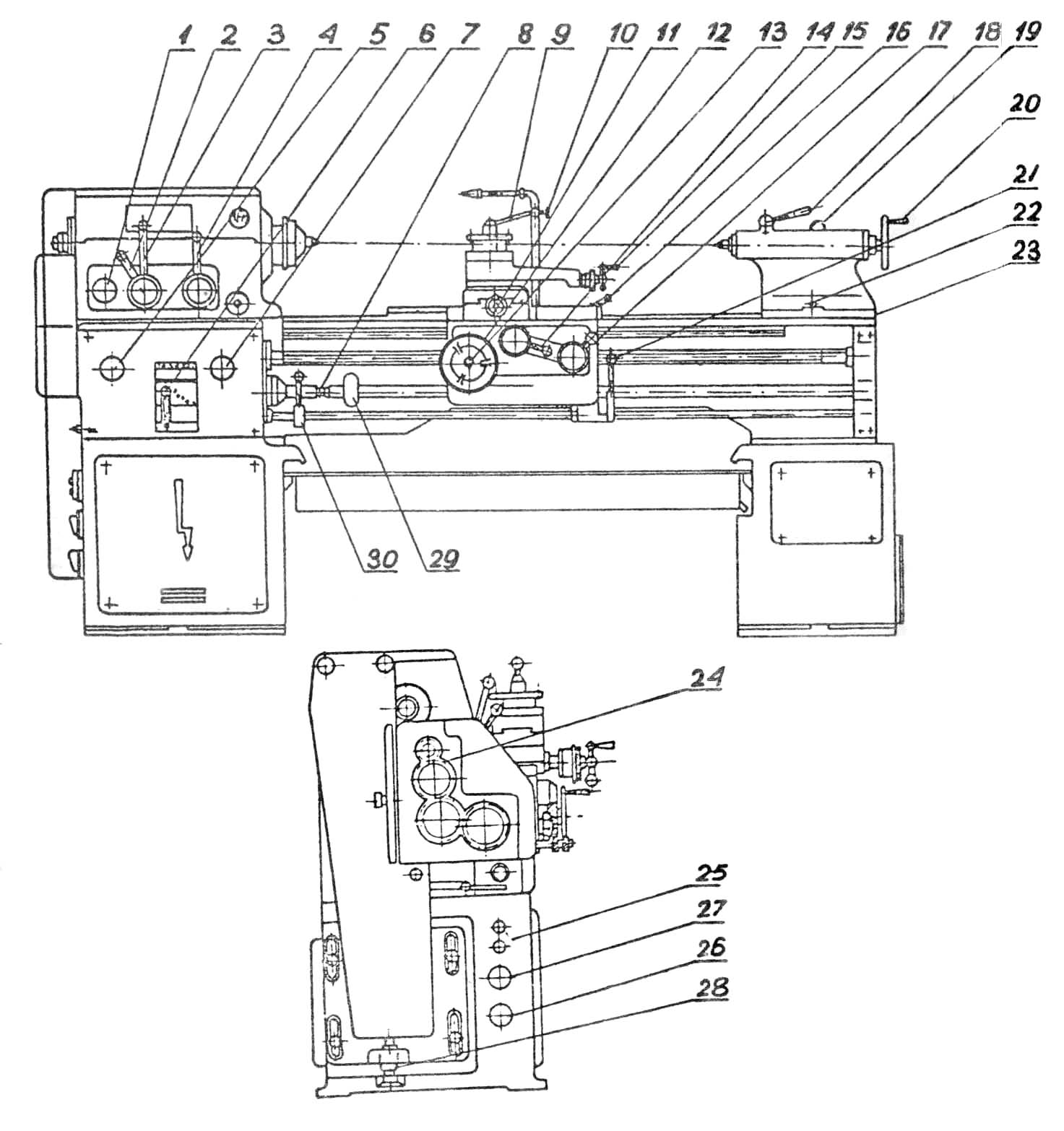 Важіль "21" - включення обертання шпинделя і "IV - включення зміни механічних подач (поздовжньої і поперечної) слід встановити в середніх положеннях, відповідних вимкненню приводу. Важіль "17" замикання роз'ємної ходової гайки повинен бути встановлений у верхнє, тобто вимкнене положення .