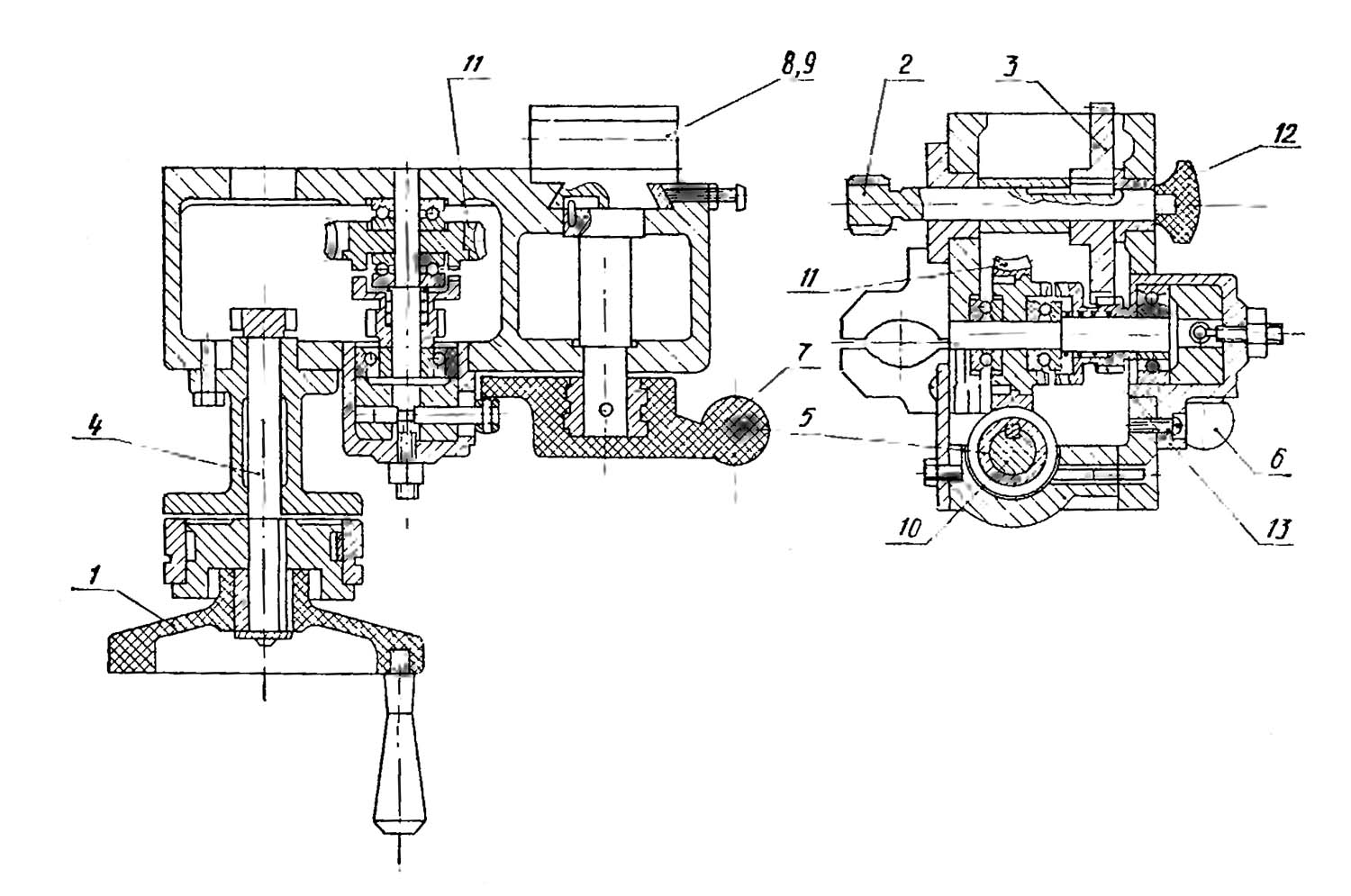На лицьовій стороні корпусу передньої бабки розташований масловказівник 11. На звороті є пробка 12 для зливу масла