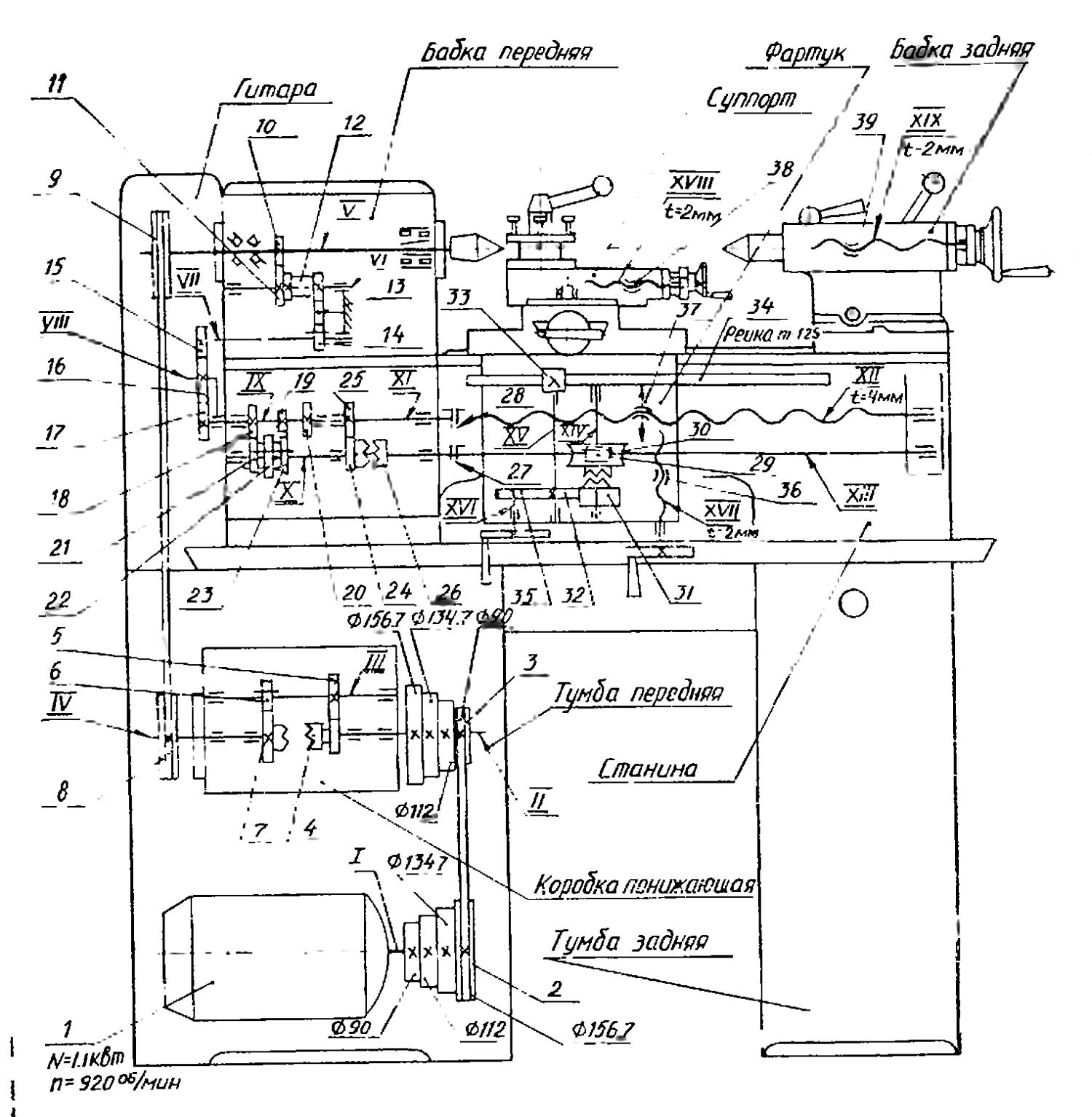 Кінематична схема токарно-гвинторізного верстата ТВ-7