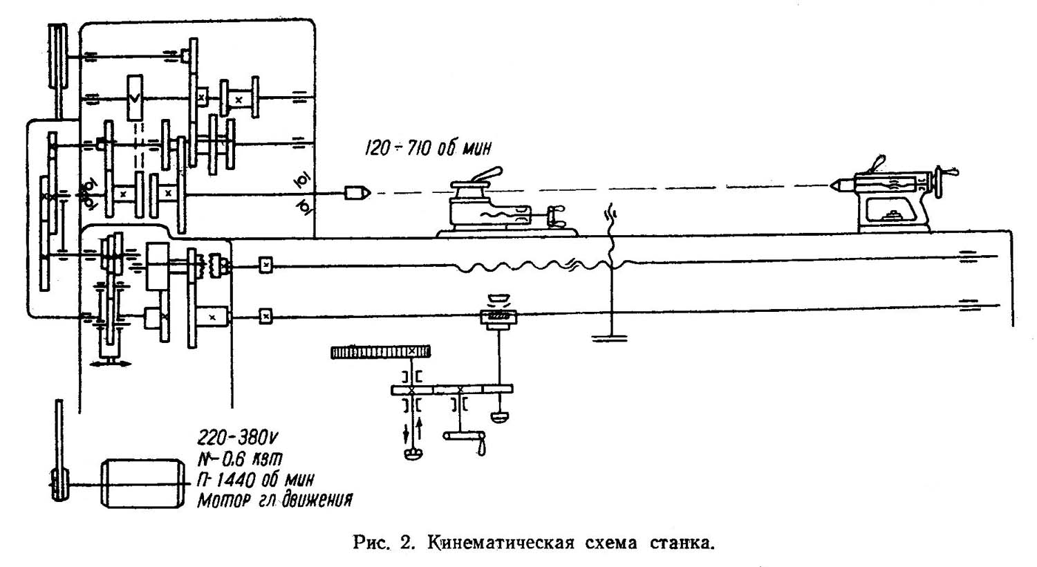 Кінематична схема. Переміщення різця здійснюється через систему шестерень вручну або механічно-самоходом.