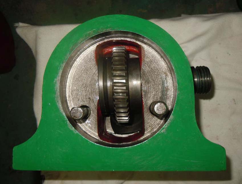 Установка червячного колеса шпинделя производится компенсационными кольцами 4, 13, 15. В зацеплении з червячным колесом 5 находится однозаходный червяк, выполненный за одно целое з валиком 32. Червяк помещается в ванночке 34, являющейся одновременно резервуаром для змазки червяка і его опорой. Другой опорой служит качающаяся цапфа 48, закрепленная в корпусе 31.
