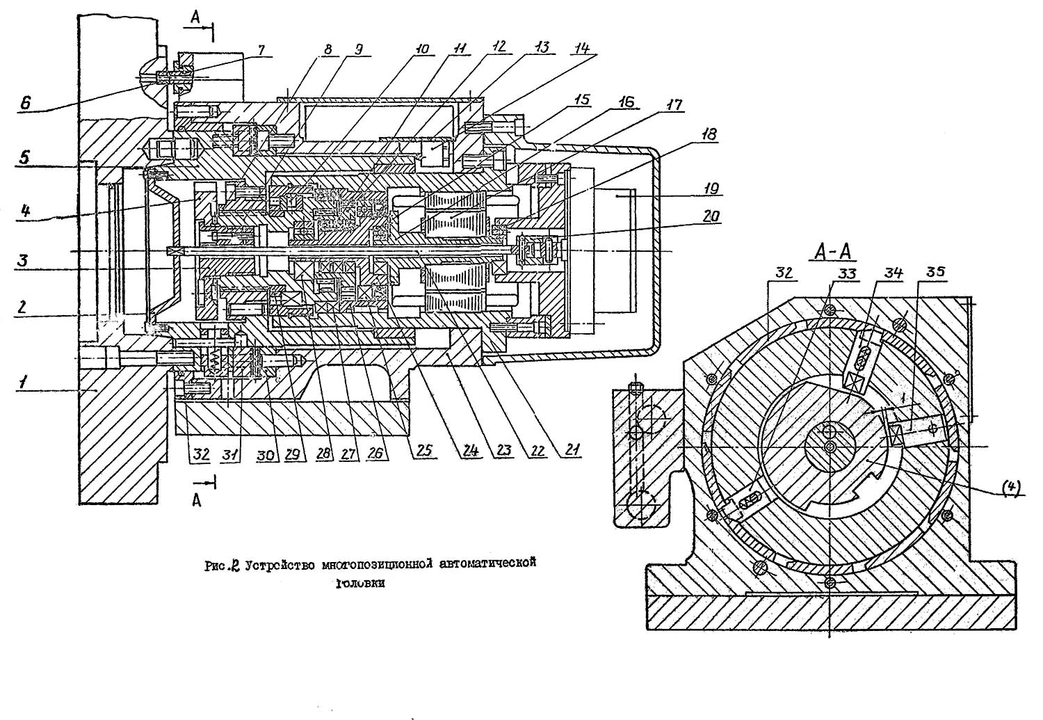 При пуске двигуна начинается вращение детали (9) і кулачка (4) против часовий стрелки. Поскольку полумуфты (3O) і (31) сцеплены і шпиндель не може вращаться, за счет взаимодействия різьб на деталь(8) і (9) происходит расцепление полумуфты. К окончанию расцепления приурочено соприкосновение уступа кулачка з пальцем (35). При продолжении поворота фиксатор (34) под воздействием скосов на дет.(32) входит в паз на кулачке, обеспечивая сцепление приводу і шпинделя. Когда инструментальный диск достигает необходимого углового положения, по команде датчика (19) осуществляется реверсирование двигуна к, соответственно, изменение направления обертання деталей головки. При етом фиксаторы (33) і (34) западают в лазы фланца (32), кулачек освобождается і происходит расцепление приводу і шпинделе. При дальнейшем вращении приводу осуществляется сцепление фиксирующих полумуфт і создание на них необходимого натяга, величина которого зависит от установки токового реле ланцюги двигуна в електросхеме верстата. Токовое реле управляет отключением електродвигуна.