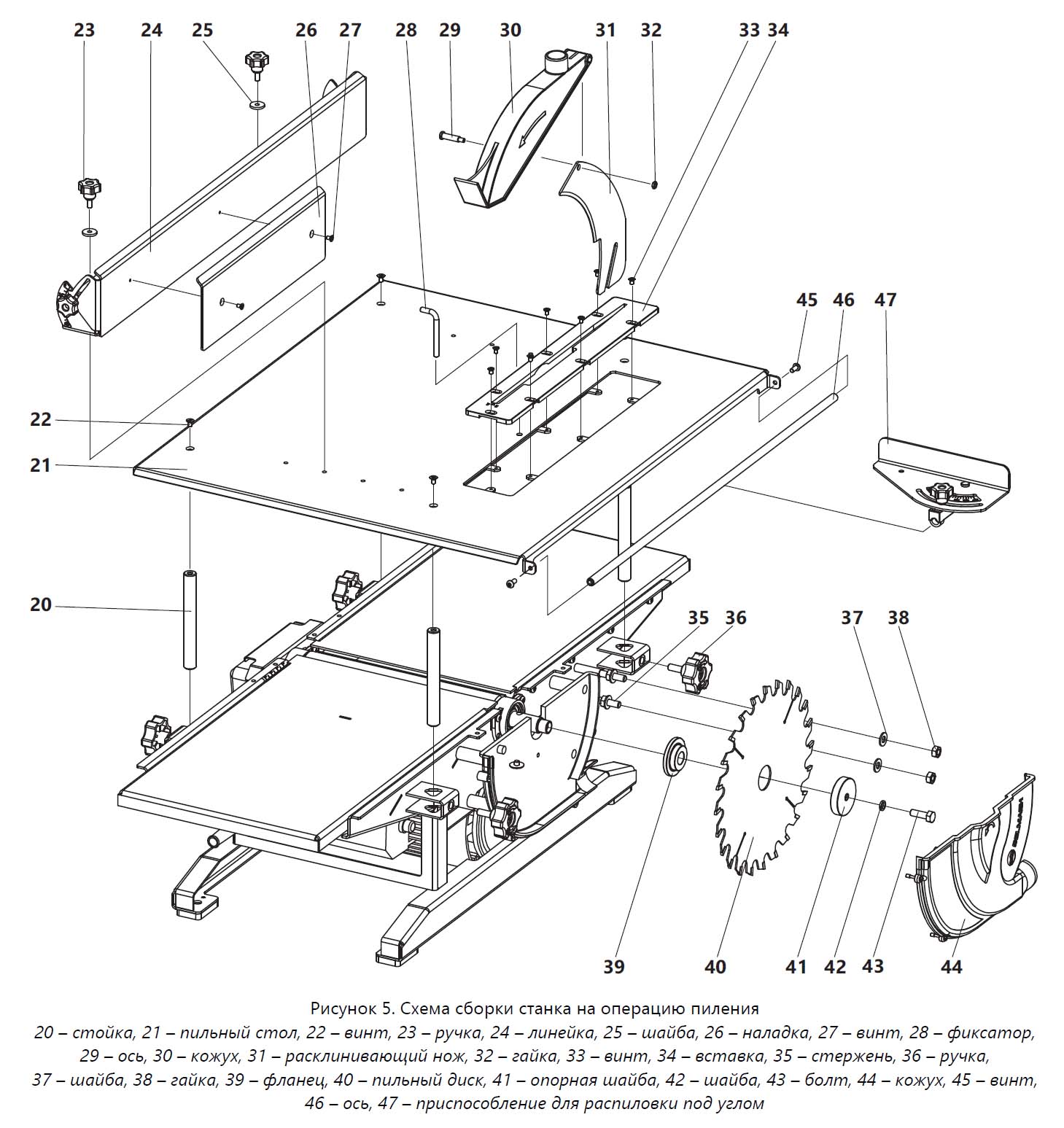 Схема сборки верстата Універсал-2500Е для операции пиления