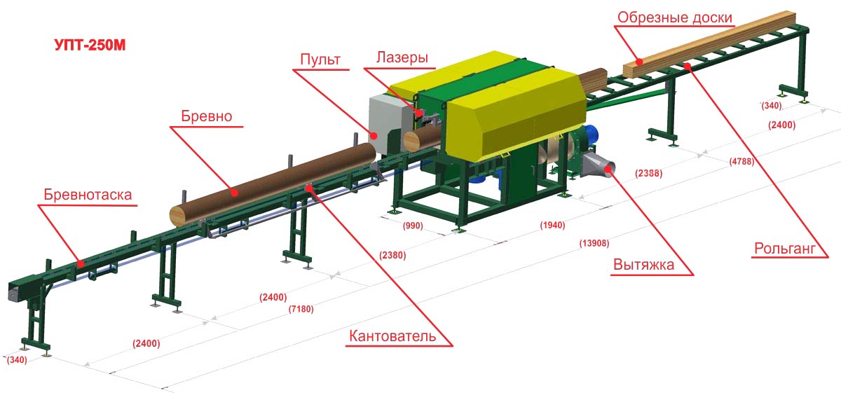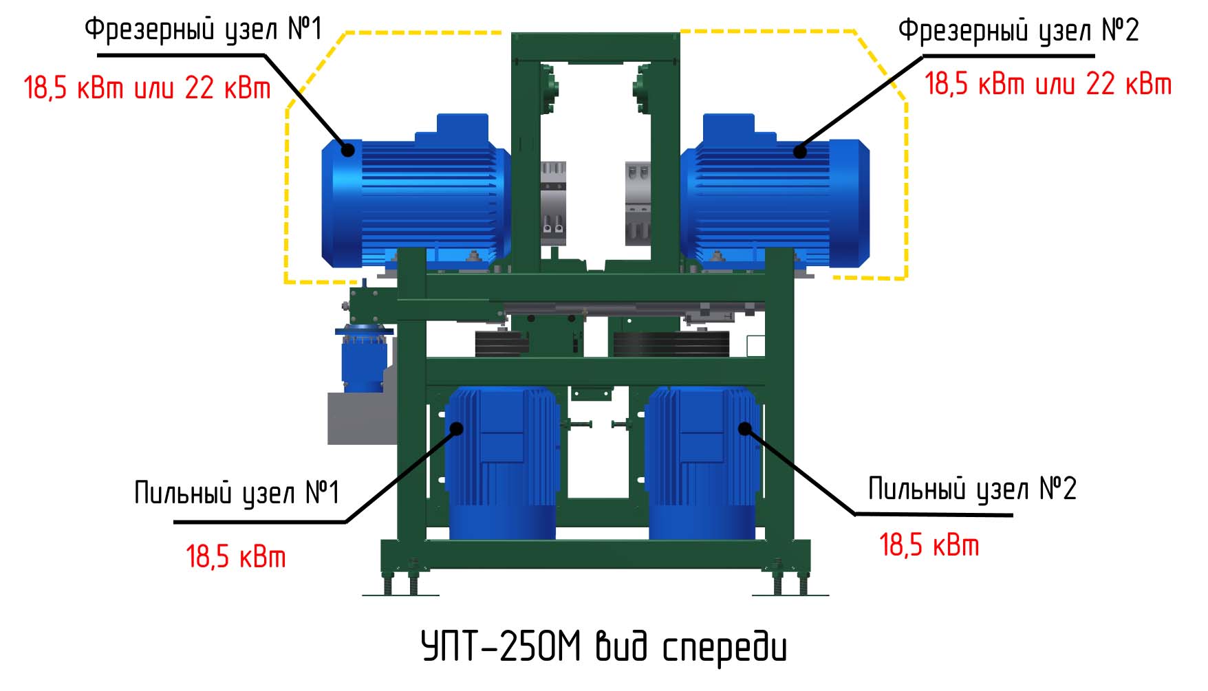 Фрезерно-пильный верстат проходного типа УПТ-250М предназначен для комплексной переработки токомерных бревен ( Ø от 80 до 280 мм) в обрезной материал.