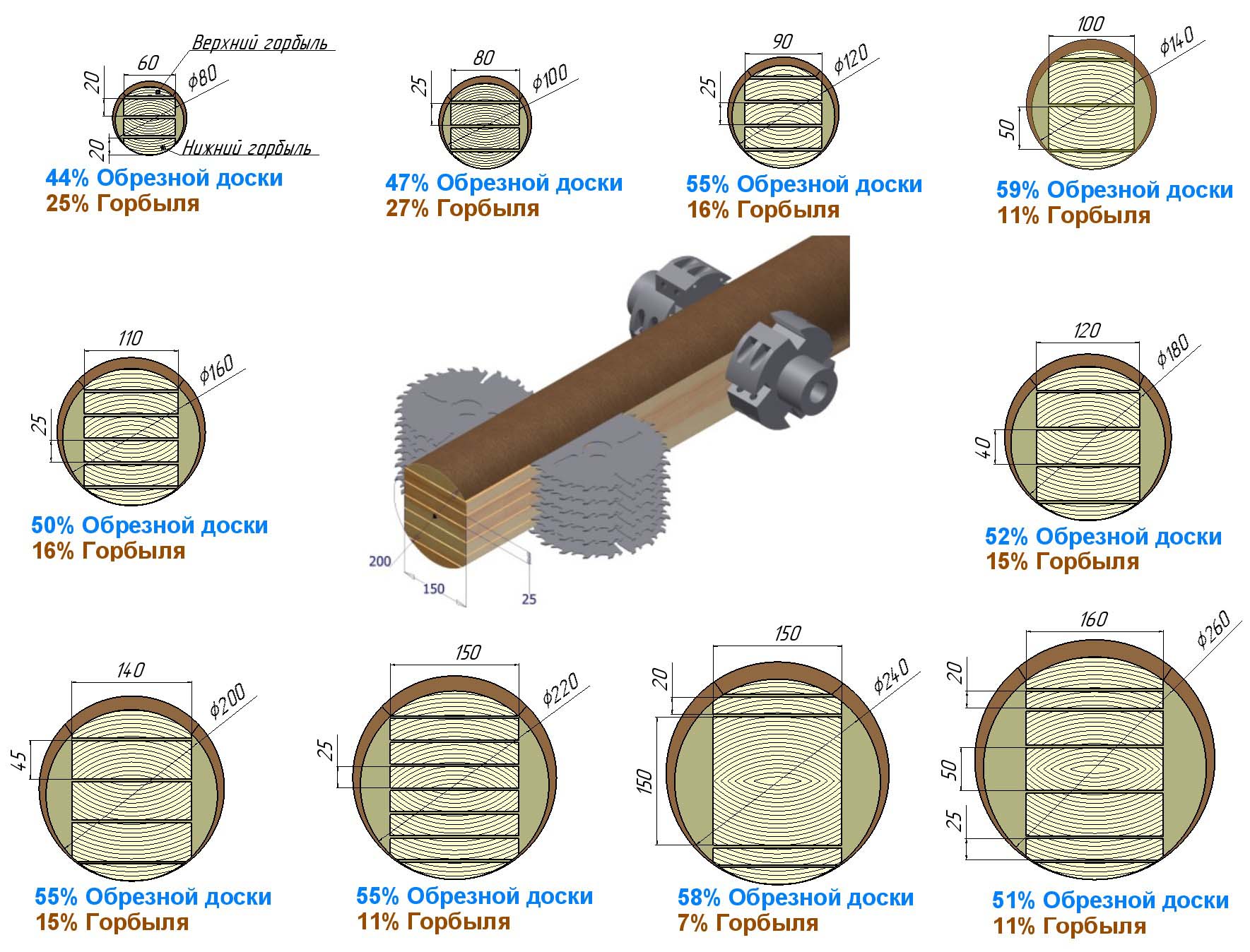 Примеры раскроя бревен различного диаметра на станке УПТ-250М
