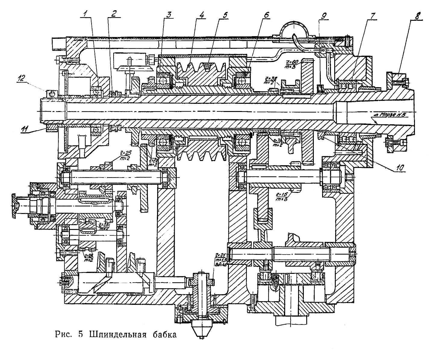 Осьові навантаження сприймаються радіально-упорним та завзятим підшипниками. У шпиндельній бабці розташовані перебір та трензель. Перебір дозволяє у вісім разів зменшити частоту обертання шпинделя, а трензель служить для реверсування та, при роботі з перебором, восьмиразового збільшення подач та кроків різьблення.