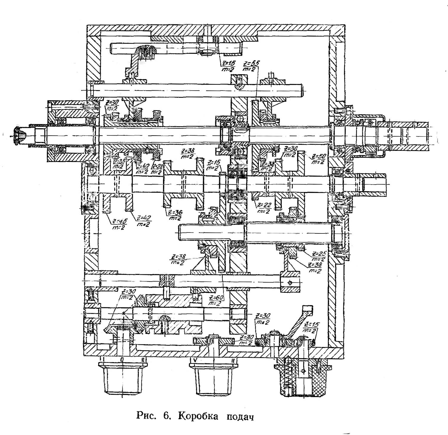 Коробка подач отримує рух від вихідного валу шпиндельної бабки через змінні зубчасті колеса.