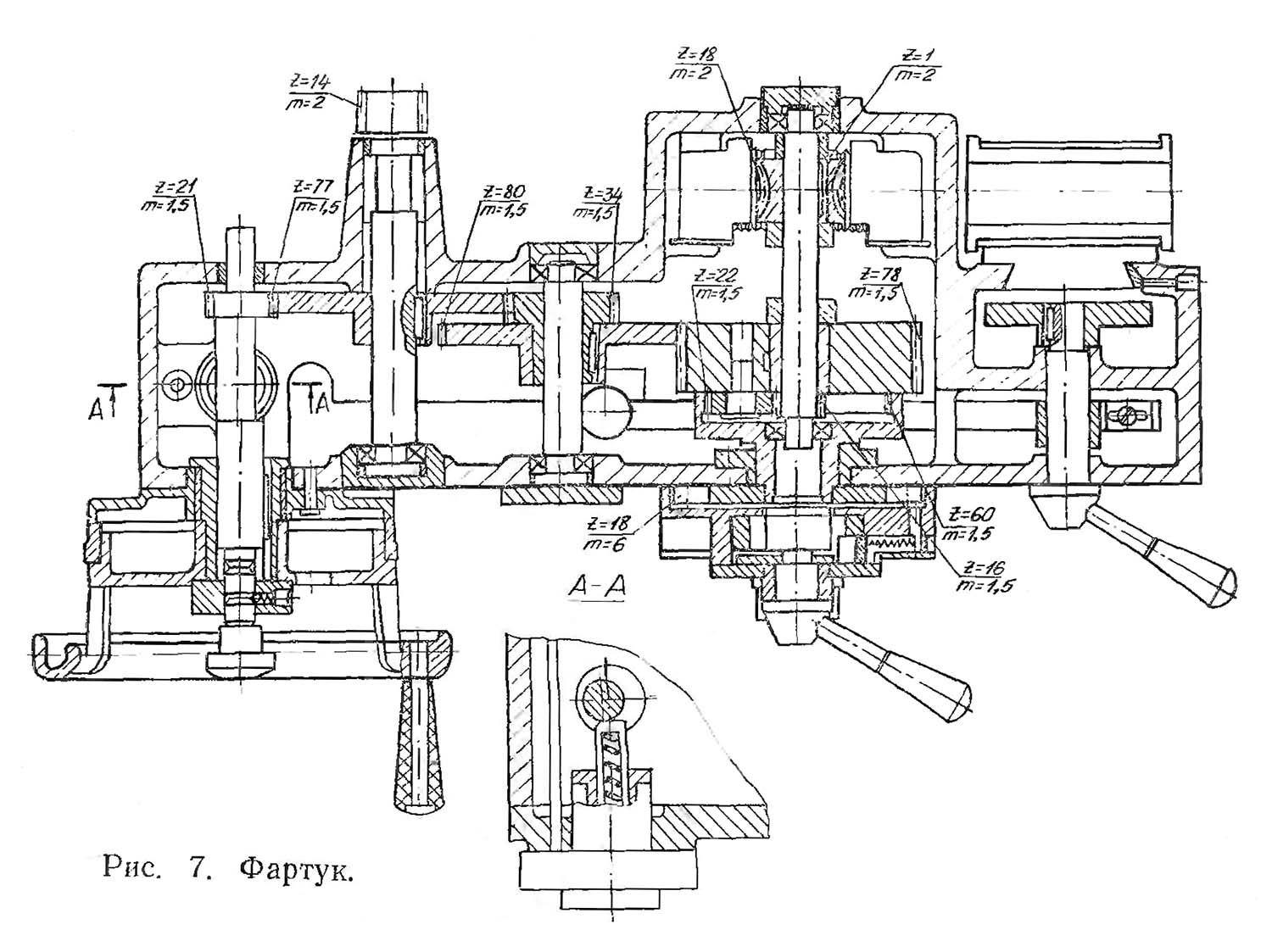Фартух (рис. 7) закритого типу забезпечує отримання поздовжніх та поперечних подач супорта вручну, механічно від коробки подач через ходовий валик, а також нарізування різьблень за допомогою ходового гвинта.