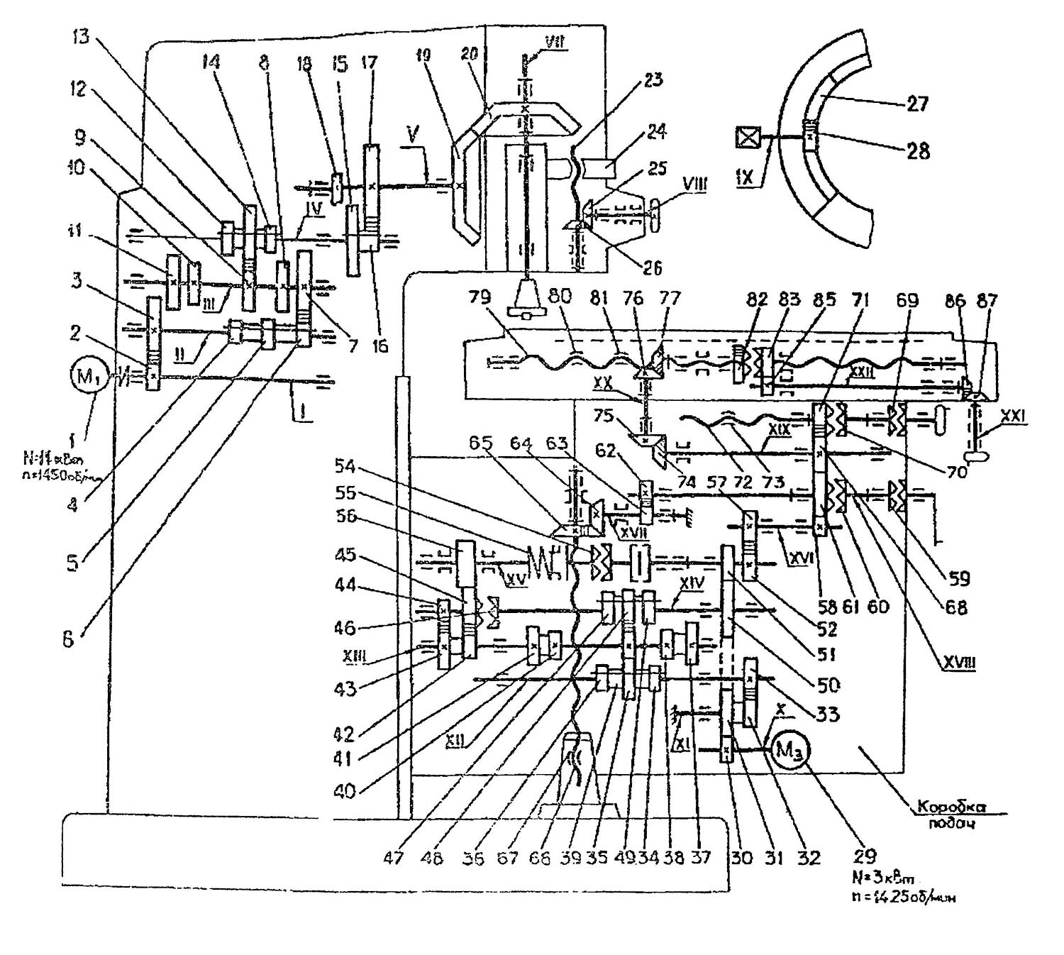 Кінематична схема фрезерного верстата ВМ127. Дивитись у збільшеному масштабі