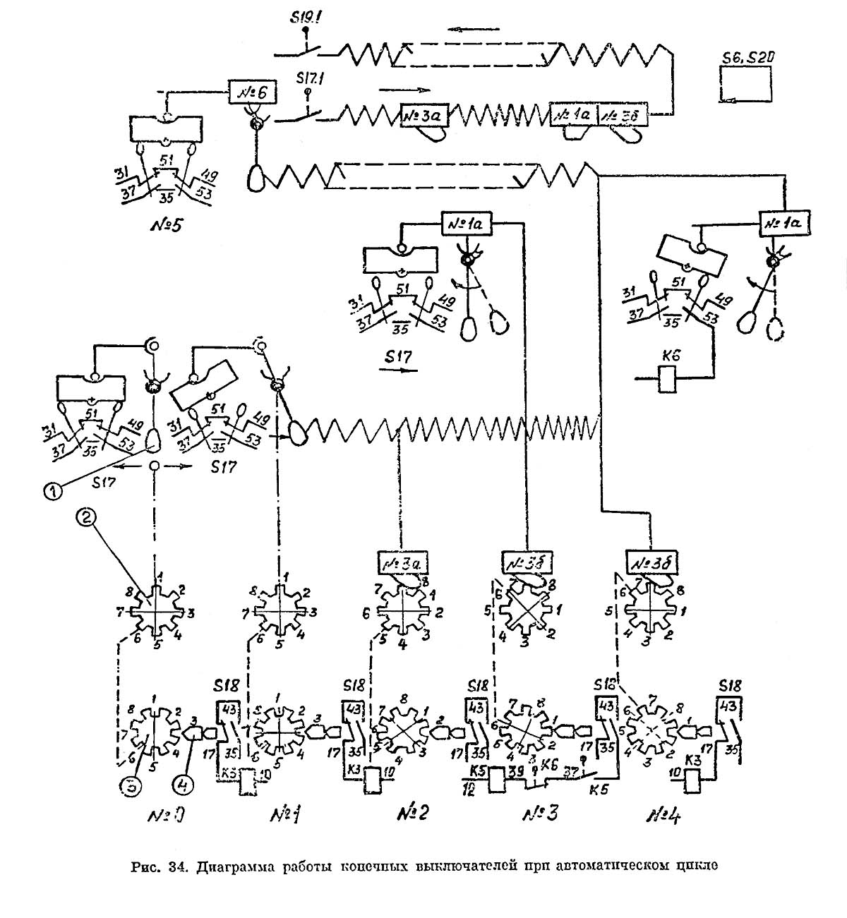 Работа електросхеми в етом режиме объясняется диаграммой і происходит следующим образом: при отключенной рукоятке 1 шток 4 должен находиться в глубокой впадине звездочки 3, контакты 41—17 конечного выключателя S18 должны быть замкнуты (положение 0 на диаграмме). С включением рукоятки 1 вправо включается быстрый ход стола вправо (положение 1 на диаграмме). Відключення швидкого ходу в нужной точке происходит при воздействии кулачка За на звездочку 2 (положение 2 на диаграмме), при повороте которой шток 4 попадает в малую впадину звездочки 3, а оба контакта конечного выключателя S18 размыкаются. Стол продолжает рух на подаче. При воздействии кулачков 1а і 3б на рукоятку 1 і звездочку 2 происходит реверс подачі і увімкнення швидкого ходу влево (положение 3 і 4 па диаграмме). При переходе рукоятки 1 через положение 0 питание пускателя Ко осуществляется через контакты 35—43 конечного выключателя S18. Шток 4 в етот момент должен находиться на участке постоянной кривизны звездочки 3 (положение 3 на диаграмме). Відключення швидкого ходу влево і конец цикла осуществляется при переводе рукоятки 1 кулачком 6 в нейтральное положение (положение 5 на диаграмме).