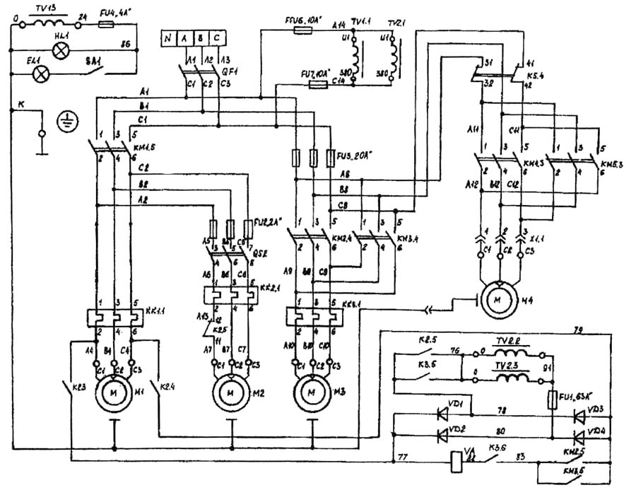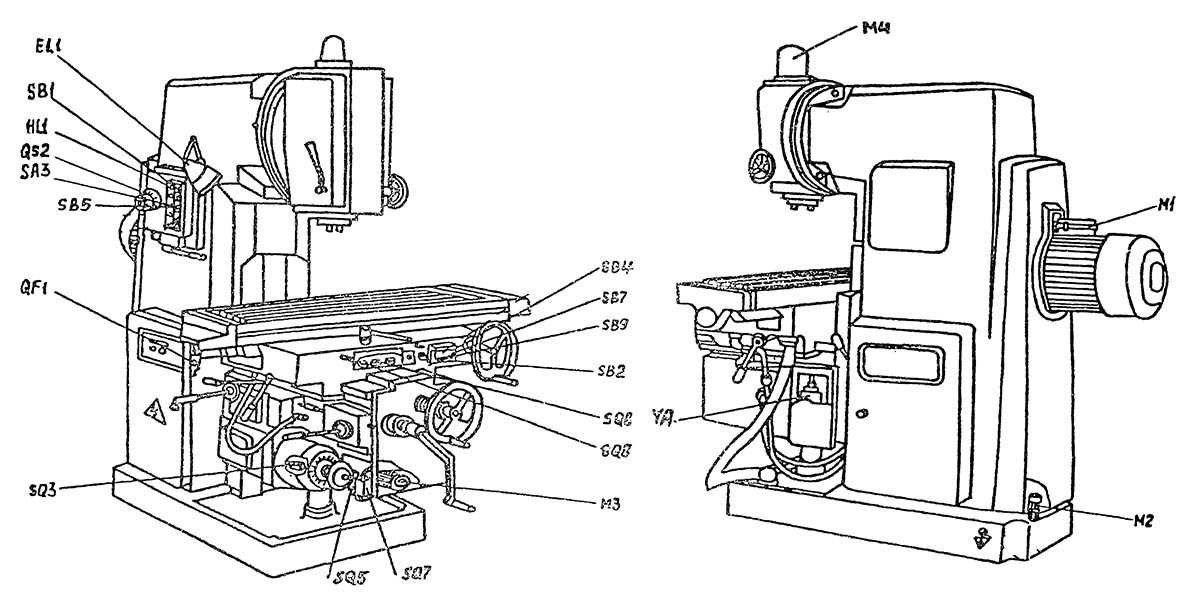 Электропривід подач представляет собой електромеханическую систему. Увімкнення і відключення подачі осуществляется рукоятками, которые имеют три. фиксированных положения, а также выключателями SQ6, SQ8 для поздовжньої; SQ5, SQ7 для вертикальной или поперечної подачі.