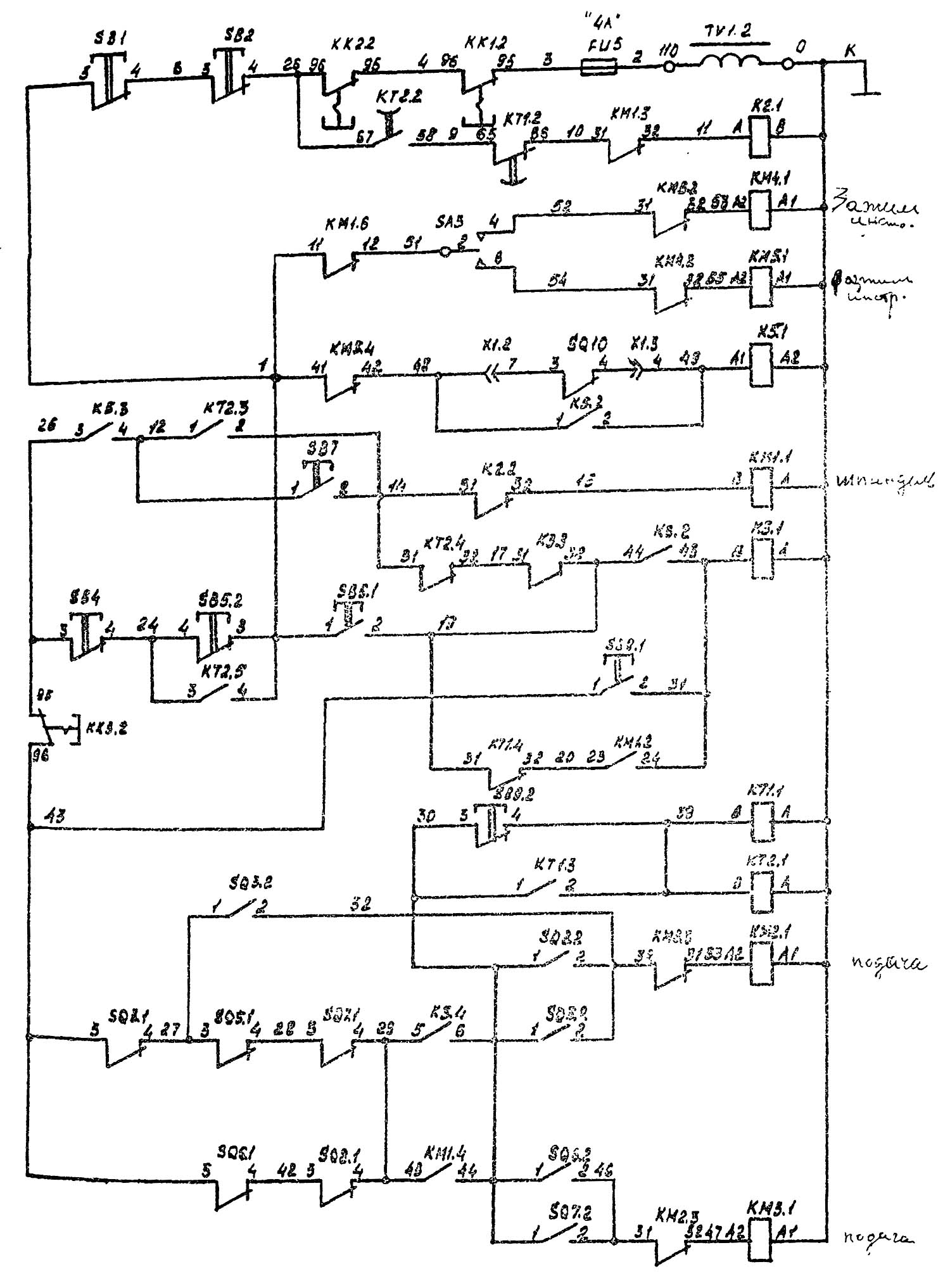 Для облегчения переключения швидкостей шпинделя і подачі предусмотрено импульсное увімкнення двигуна шпинделя Ml кнопкой SB5, двигуна подачі М3 выключателем SQ3.
