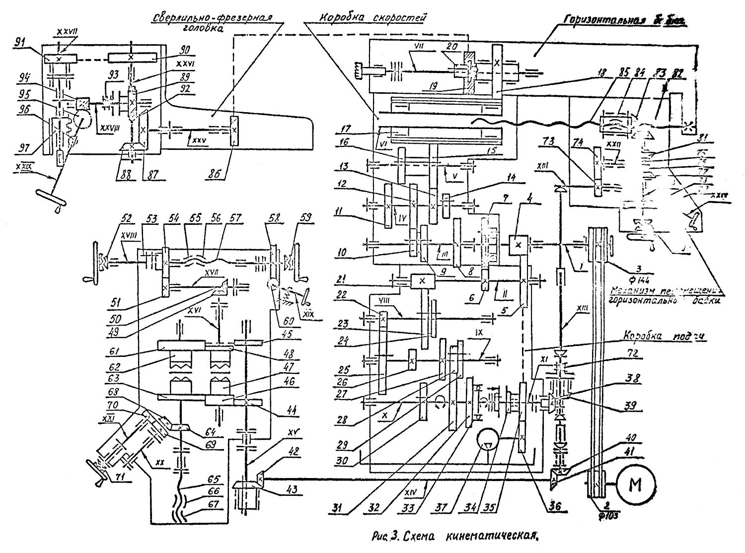 Кінематична схема фрезерного верстата ВМ-130. Дивитись у збільшеному масштабі