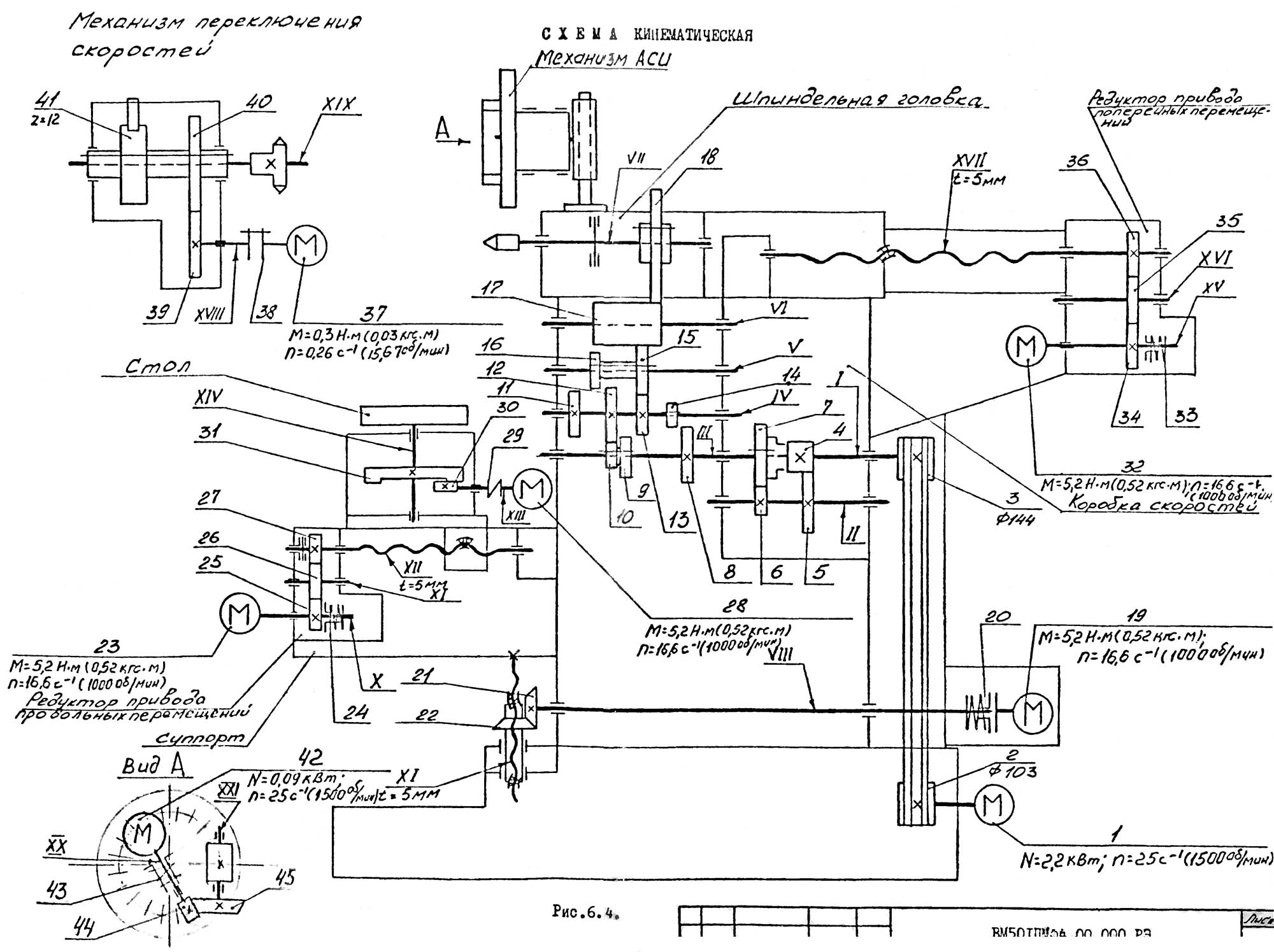 Схема кінематична горизонтального сверлильно-фрезерно-расточного верстата ВМ501ПМФ4. Дивитись у збільшеному масштабі