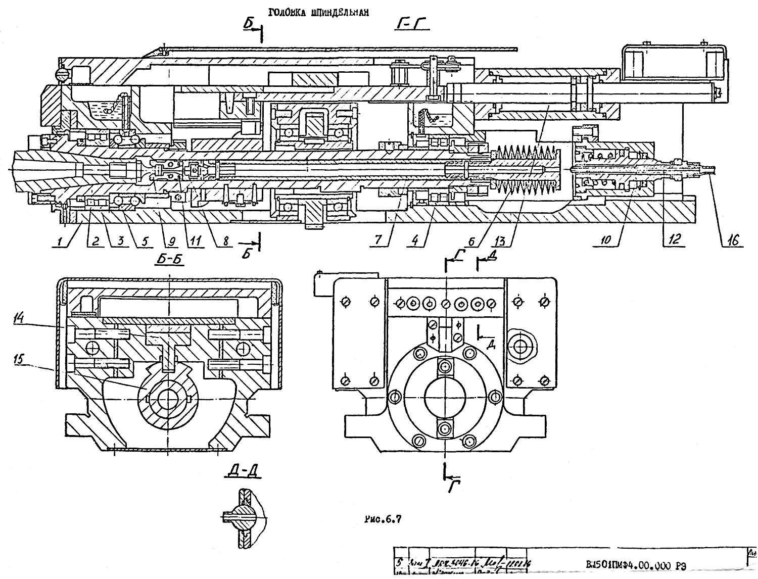 В корпусе 1 шпиндельной головки (рис 6.7) смонтирован шпиндель 2. Передней і задньої опорами служат радиальные двухрядные роликовые підшипники 3 і 4. Осевые нагрузки, действующие на шпиндель, воспринимаются опорно-радиальным подшипником 5, смонтированным в передньої опоре. Шпиндельная головка перемещается в поперечном направлении по направляющим станины. Перемещение осуществляется при помощи передачи винт-гайка качения, корпус которой жестко прикреплен к корпусу шпиндельной головки. Зажим направляючих шпиндельной головки производится з помощью двух мембранных камер, расположенных в планках направляючих станины при подаче к ним давления масла.