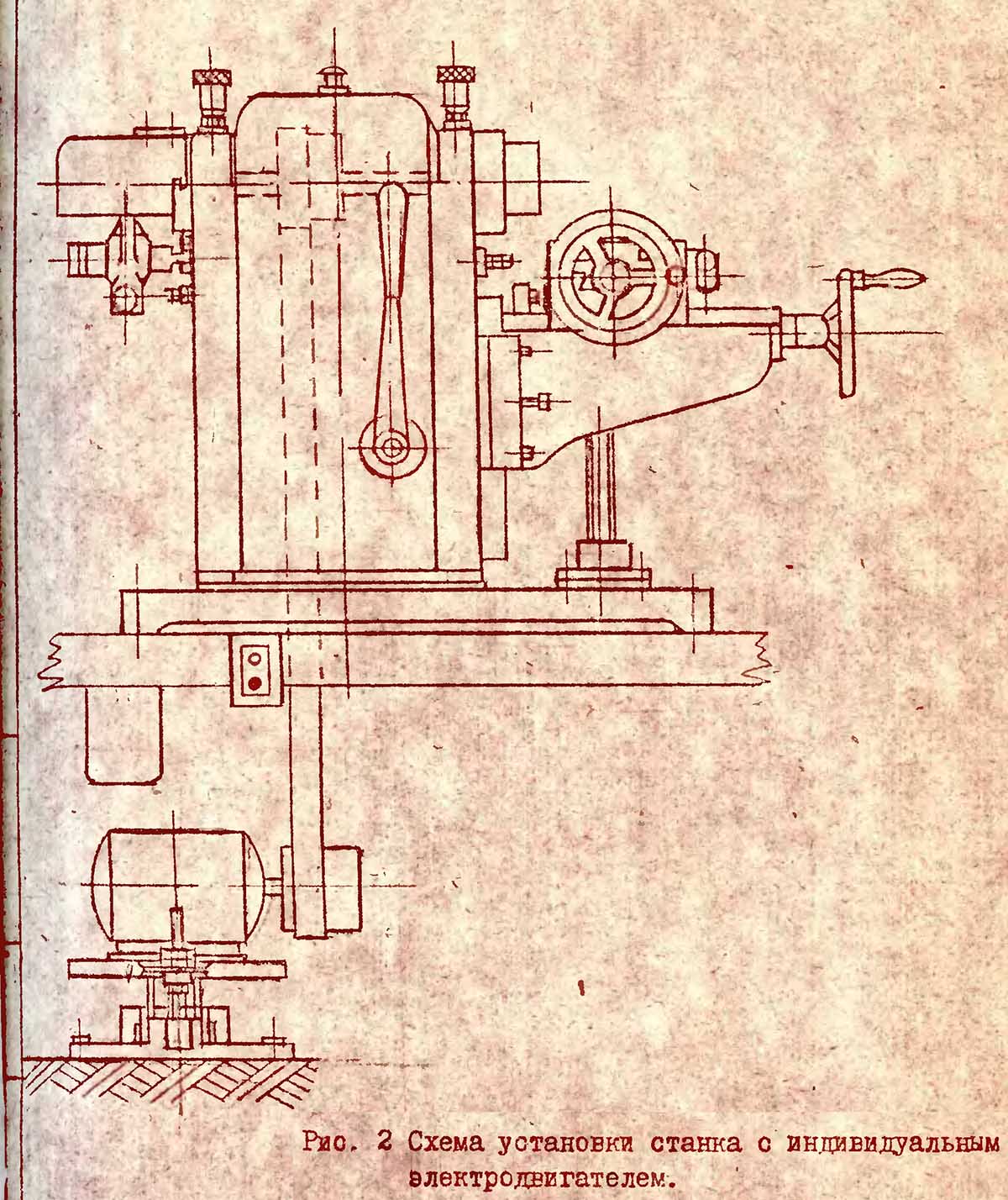 Обертання електродвигуна передається трансмісійному валу групи верстатів і далі через плоскочасну передачу на шків шпинделя.