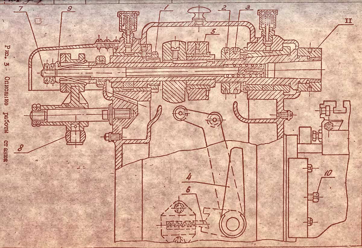 Шпиндель монтується на опорах ковзання, регулювання посадки яких здійснюється гайками 1, 2, 3.