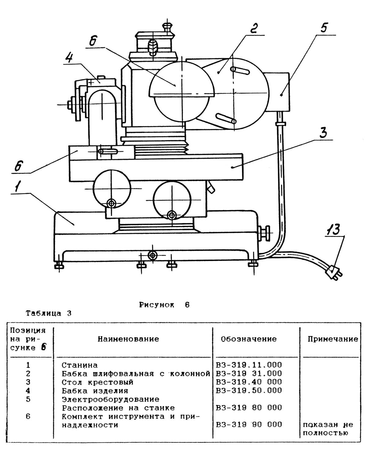 Верстат ВЗ-319 складається зі станини коробчастої форми, усередині якої є ніша з електроустаткуванням. На станині змонтовано колону та хрестовий стіл. Колона несе на собі шліфувальну бабку. На дзеркало хрестового столу встановлюється поворотний стіл або каретка з бабкою виробу. Наявність у станині паза для перевстановлення хрестового столу та його повороту дозволяє значно розширити робочу зону верстата за мінімальних габаритів.