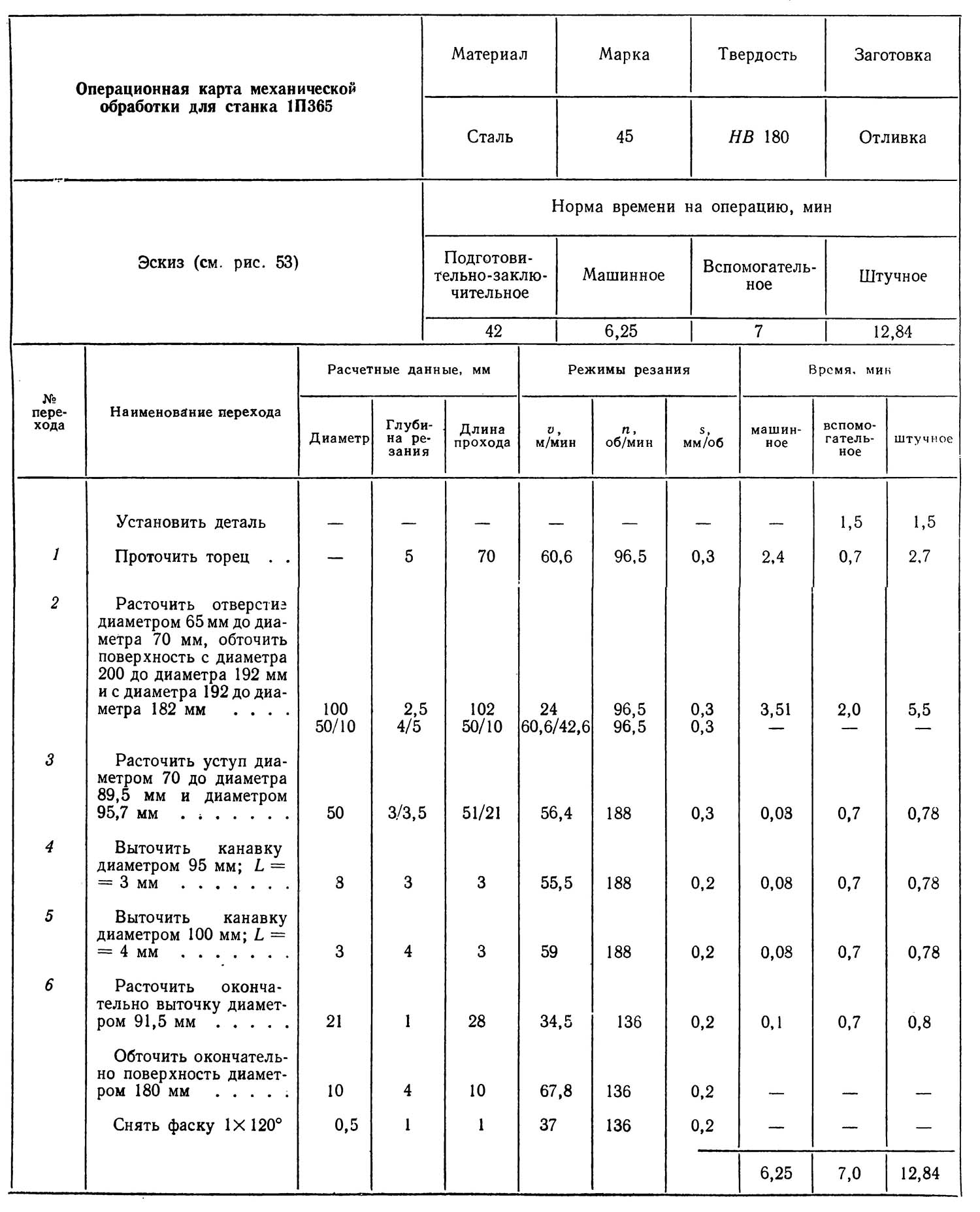 При построении технологических процессов при малой длине прохода инструмента нужно стремиться для всех переходов і операций брать одинаковую частоту обертання шпинделя, так как при разных частотах приходится часто переключать скорости обертання шпинделя, что увеличивает вспомогательное время, быстрее изнашивает коробку швидкостей і сильно утомляет робочого. Когда рабочий путь инструмента большой, всегда следует просчитывать выгодность перехода на другую частоту обертання или на увеличение подачі. В графу машинное время записывают время в минутах, потребное на обработку заготовки на каждом переходе. Машинное время