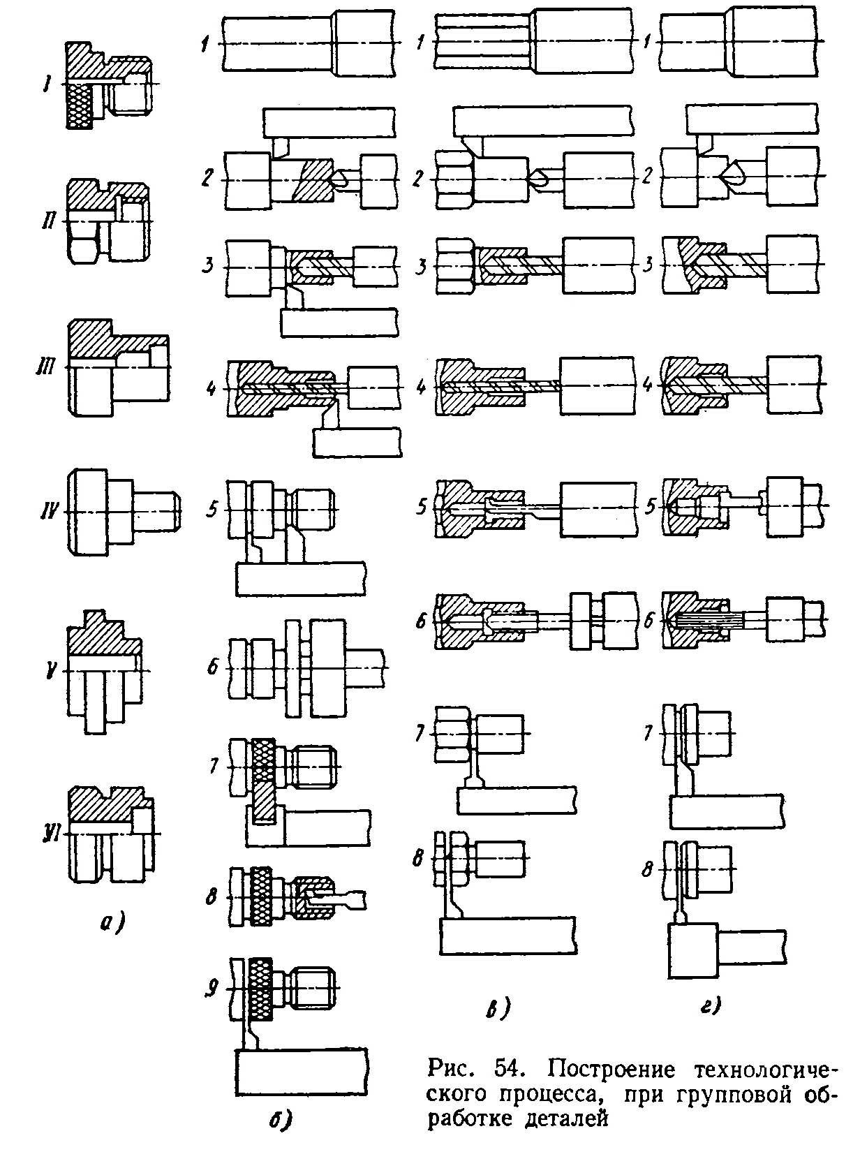 Державки і приспособления не указываются, так как они были указаны в карте комплексной детали. Все технологические карты, рассчитанные на детали данной группы, подшиваются в одну папку. Нужно учитывать, чтобы все детали данной группы обрабатывались з одних і тех же державок і пристосувань, что і комплексная деталь. Если ети условия соблюдены, то при переналагодженні верстата на новую деталь нужно будет заменить подающую і зажимную цанги (если применяется патрон з цанговым зажимом), частинично режущие инструменты і отрегулировать установку упоров на требующиеся розміри для данной детали. На рис. 54, а показаны детали, входящие в одну группу для обробки на револьверном станке; деталь / комплексная. На рис. 54, б показана примерная расстановка инструмента при наладке, которая занимает девять позиций. При расстановке инструмента для налагодження на деталь II в позиции 4 (рис. 54, в) снимается фасочный різець, в позиции 5 — канавочный різець. В позиции 6 заменена державка з плашкой на державку з метчиком.