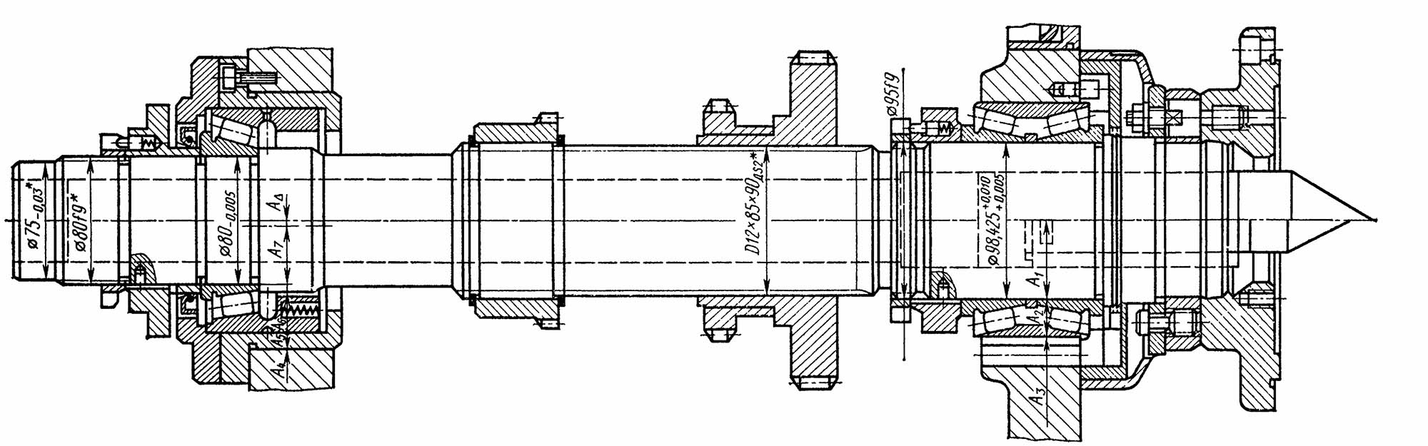 На рис. 97 изображен шпиндельный узел токарно-гвинторізного верстата 16К20. Передней опорой шпинделя служит конічний двухрядный роликоподшипник 6 з малым углом конуса у внутреннего кольца і буртом на наружном кольце. Задний конец шпинделя опирается на конічний однорядный роликоподшипник 2 з малым углом конуса і автоматическим усуненням зазоров.