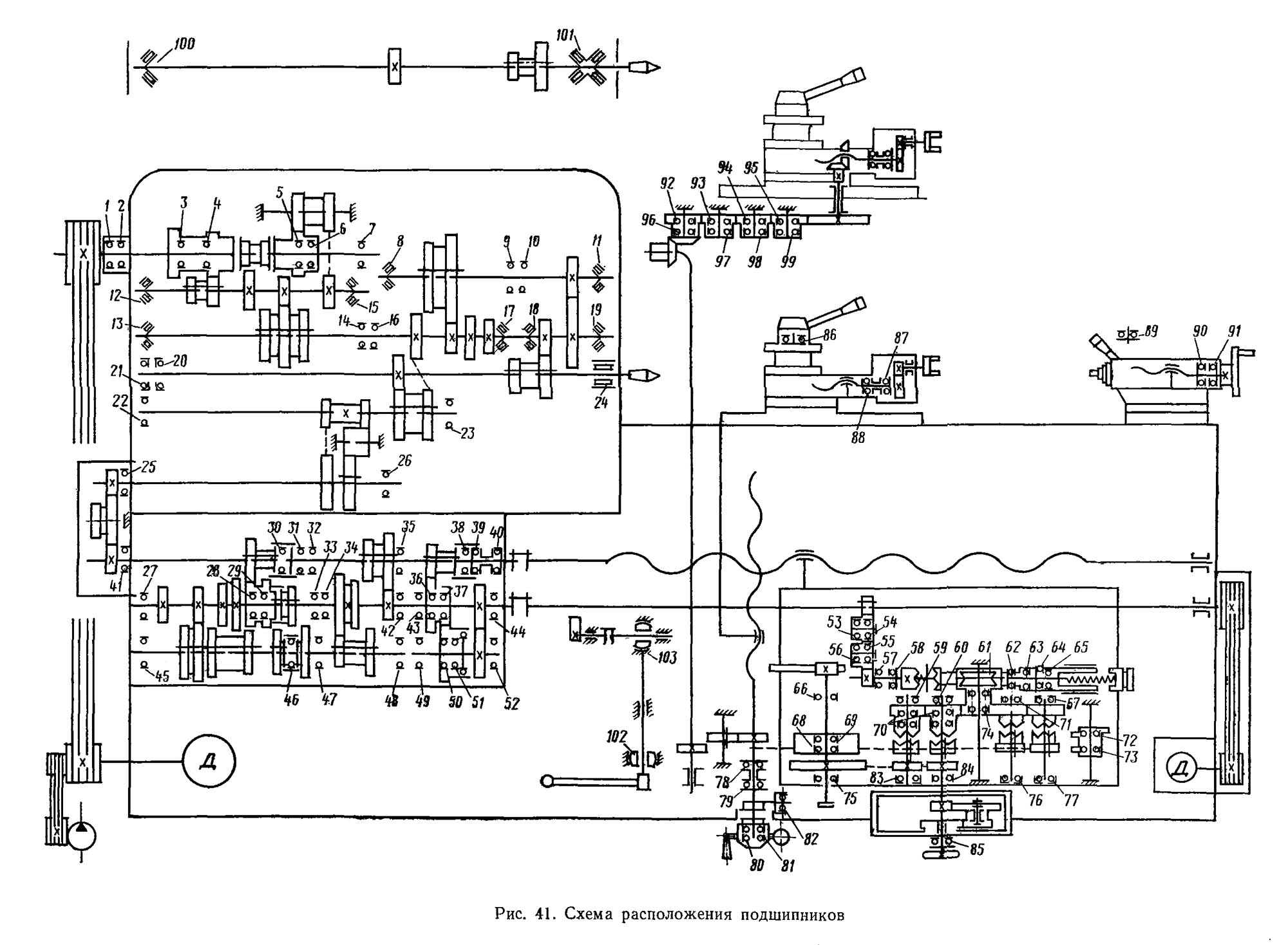 Схема встановлення підшипників токарно-гвинторізного верстата 16к20. Дивитись у збільшеному масштабі