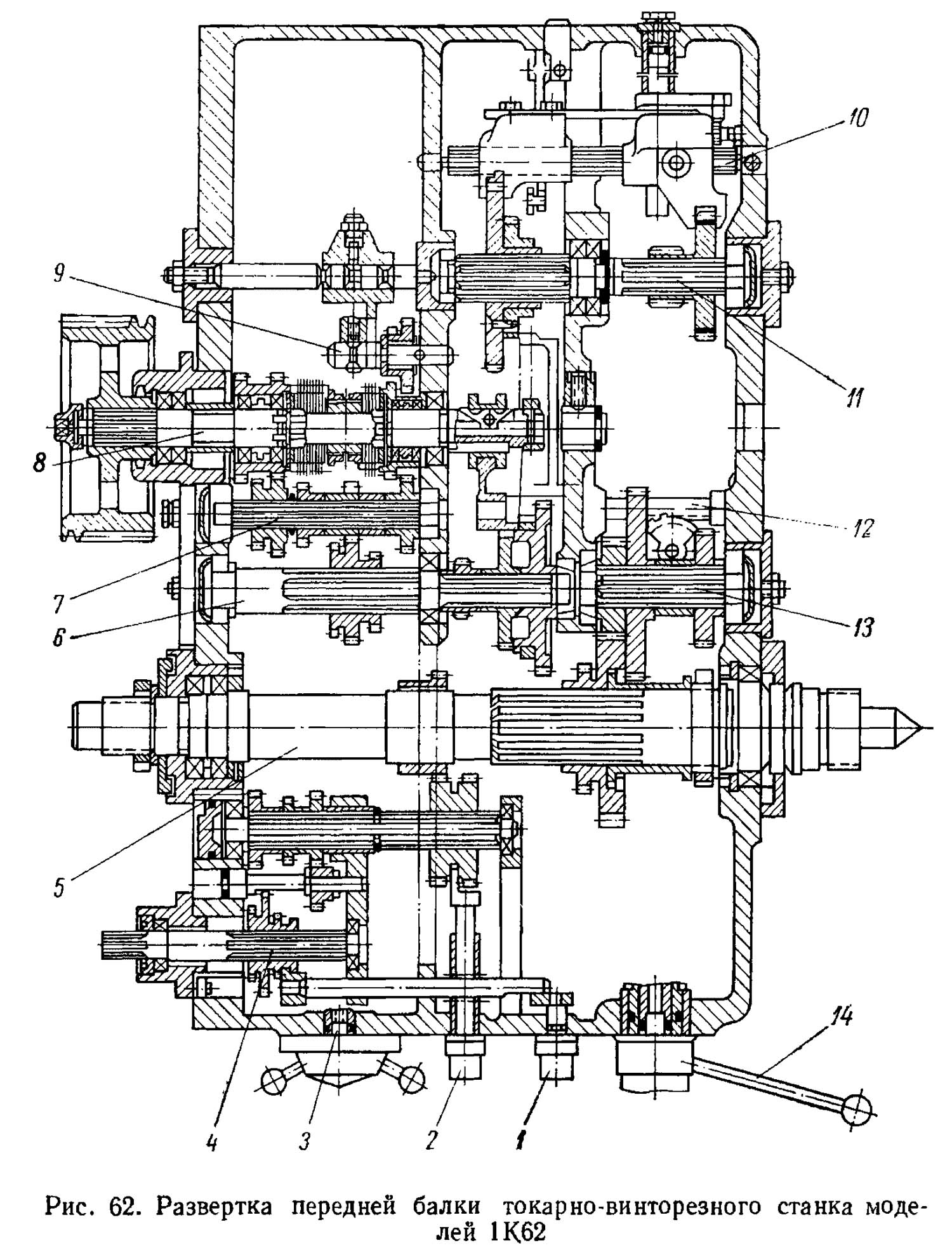 Токарно-гвинторізні верстати мають практично однотипне компонування. Передня шпиндельна бабка закріплена на лівому кінці станини. У ній знаходиться коробка швидкостей верстата, основною частининою якої є шпиндель. Рух передається від шківа клинопасової передачі. Взаємодія зубчастиних коліс пояснена під час опису кінематичної схеми. Шпиндель та всі вали встановлені на опорах кочення. У передній опорі шпинделя знаходиться радіальний дворядний роликовий підшипник, у якому попередній натяг створюється завдяки посадці внутрішнього кільця на конічну шийку шпинделя. Якщо насувати гайкою кільце на конус, воно розширюється і тисне на ролики. У задній опорі шпинделя встановлені два радіально-упорні шарикопідшипники, що сприймають радіальні та осьові навантаження; попередній натяг регулюють гайкою, що стягує внутрішні кільця. Вали коробки швидкостей змонтовані на конічних роликопідшипниках, що зручно для збирання та розбирання; попередній натяг регулюють натискними ггвинтами. Оскільки вали довгі, у них передбачена середня опора.