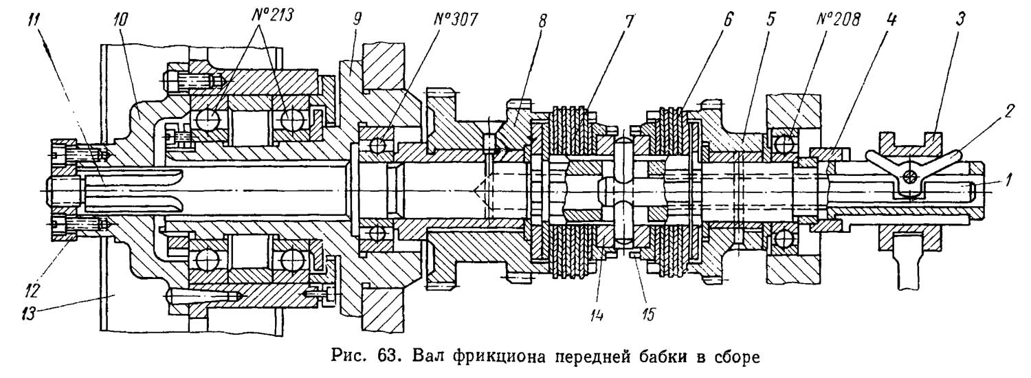 Найбільш складними вузлами передньої бабки є вал 8 фрикціону та шпиндель 5, складання яких розглянуто нижче.