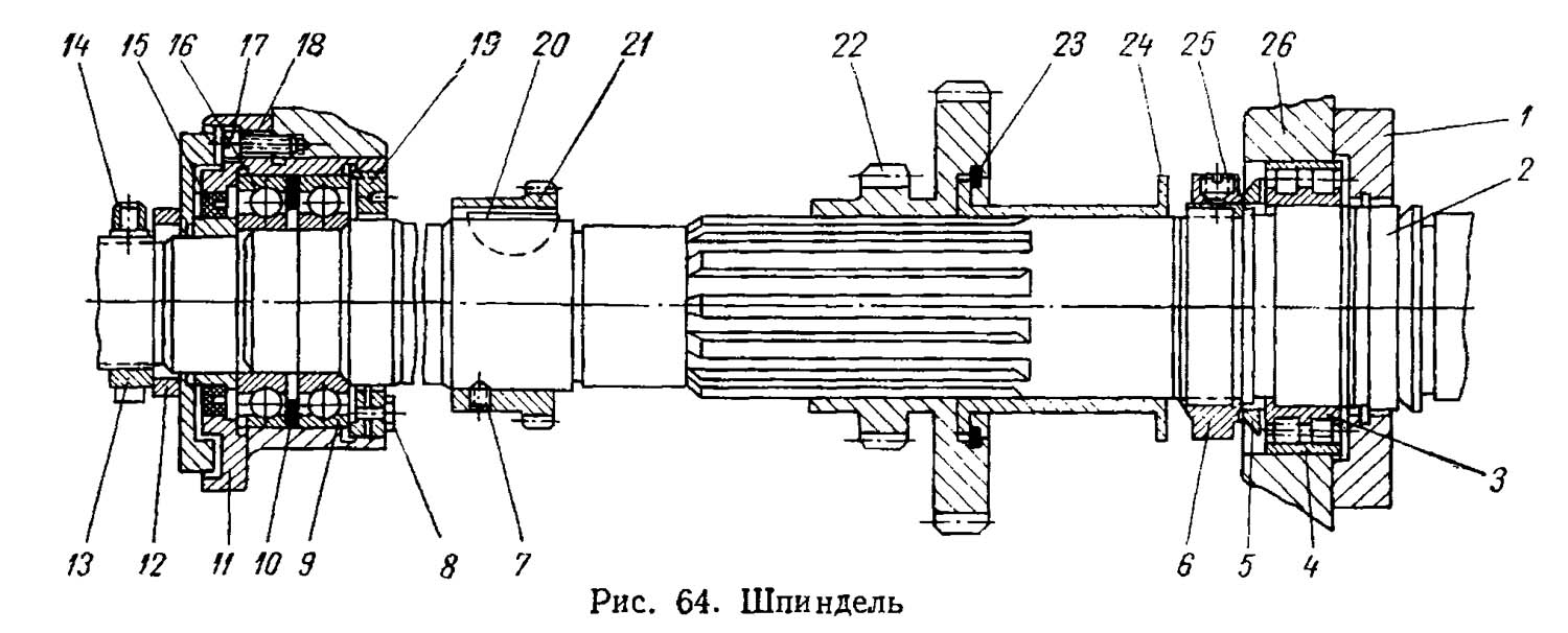 Встановивши на кінці шпинделя кільця 11 і 12, нагвинчують ключем гайку 13, поки шпиндель не стане на своє місце, що визначають зусилля затягування і обертання шпинделя. Спочатку спостерігається осьове переміщення шпинделя при його рівномірному обертанні, надалі осьове переміщення шпинделя припиняється і його обертання стає тугим.