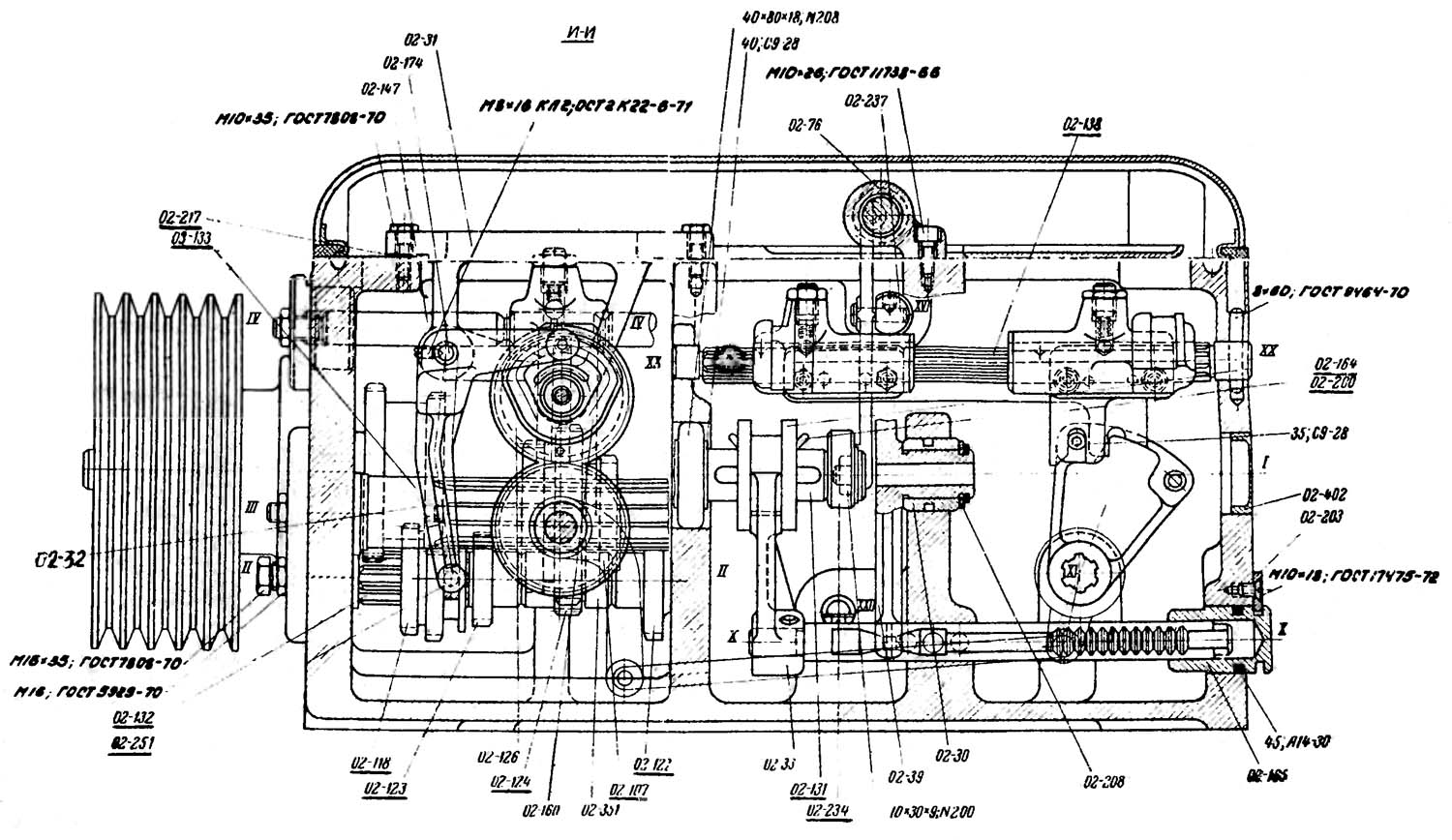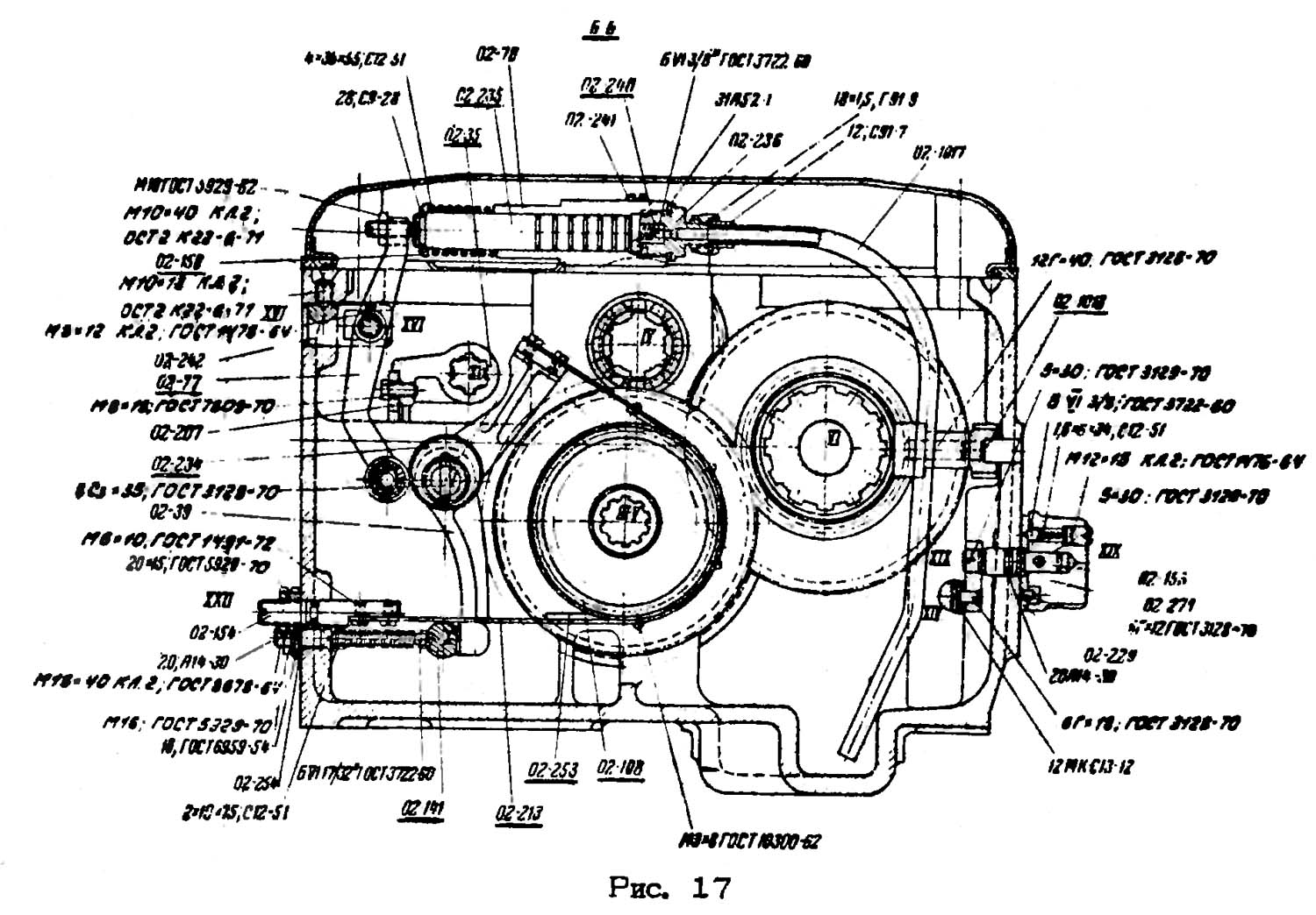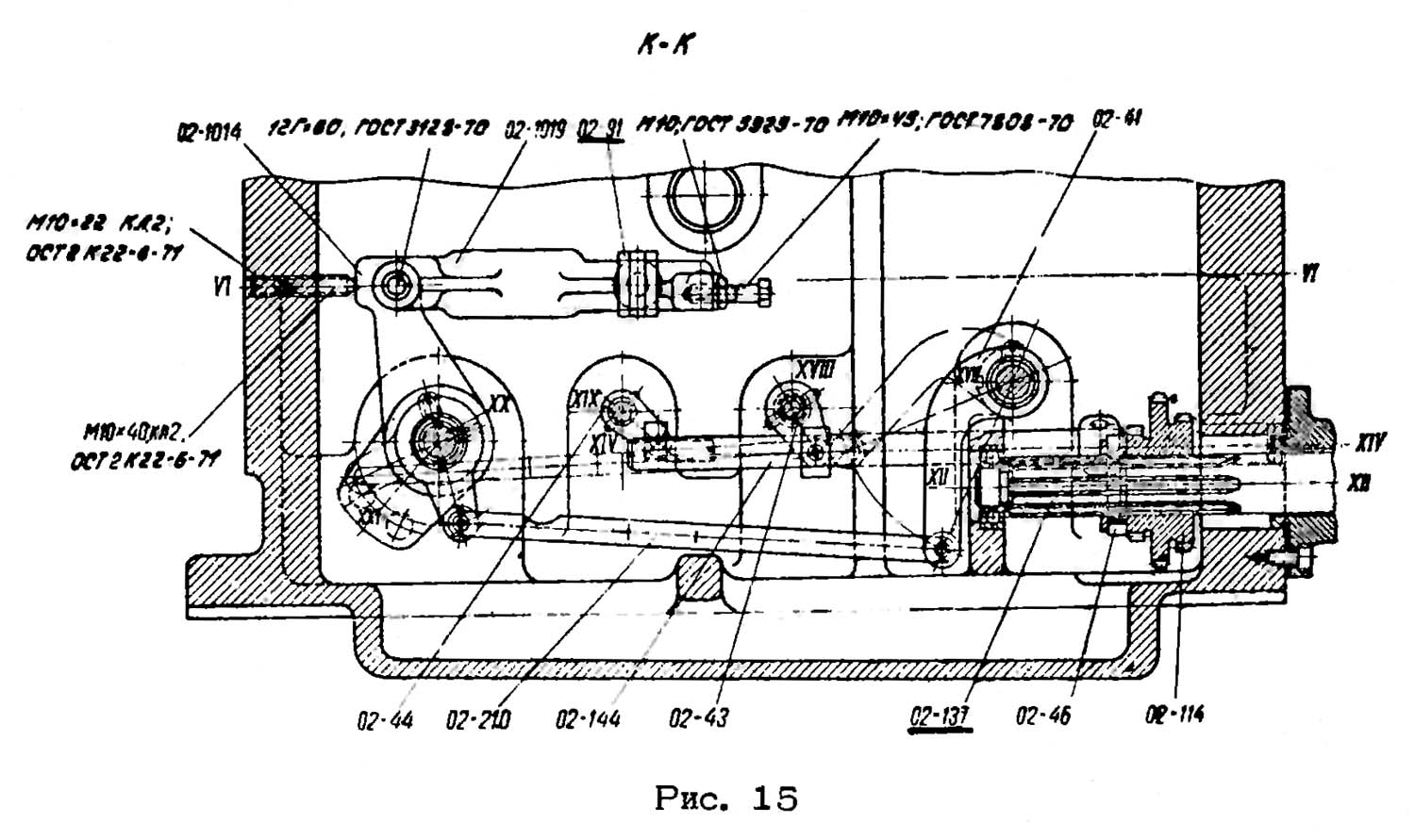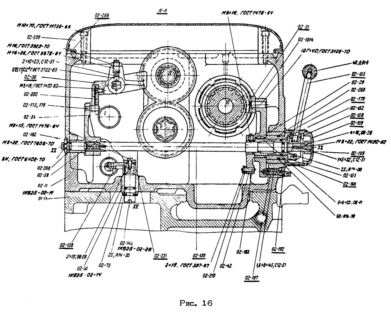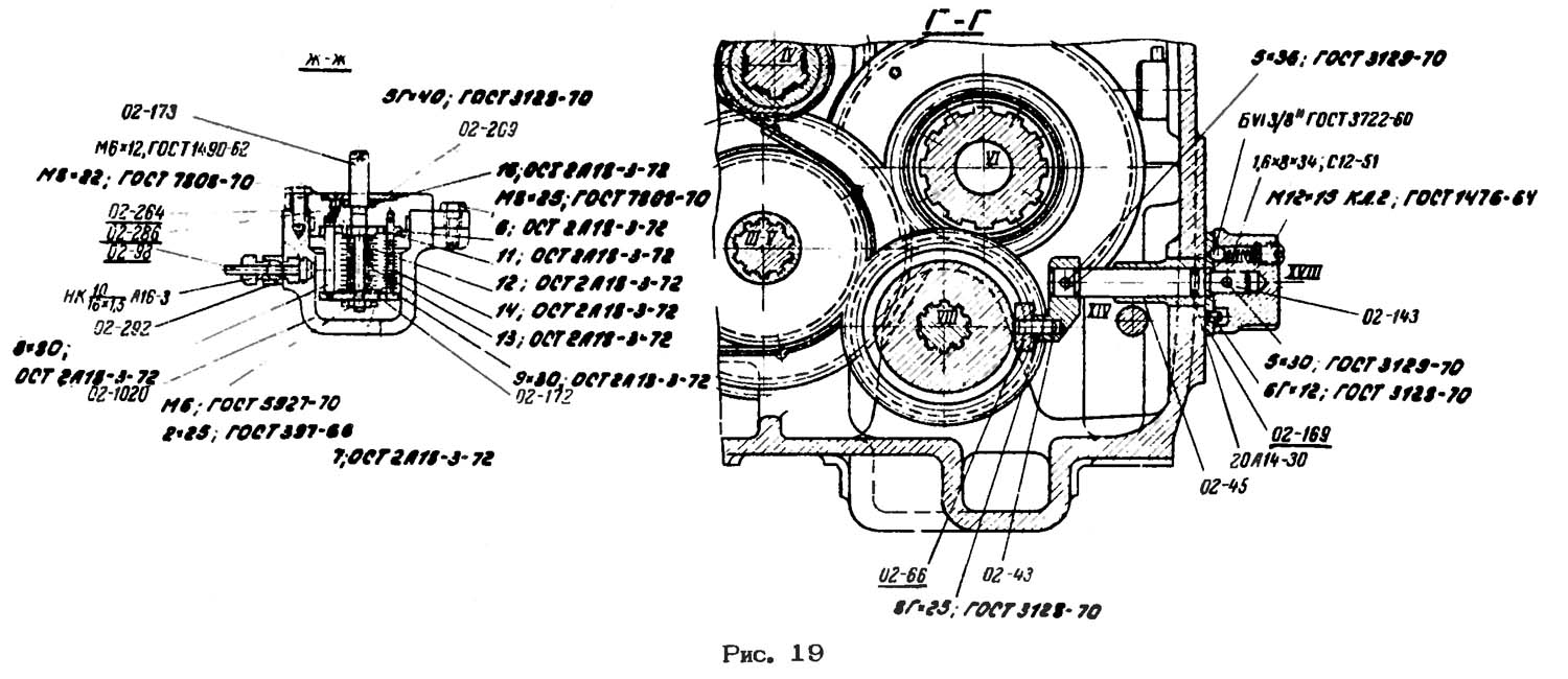 Мал. 17. Механізм перемикання фрикціонів у шпиндельній бабці токарно-гвинторізного верстата 1к62
