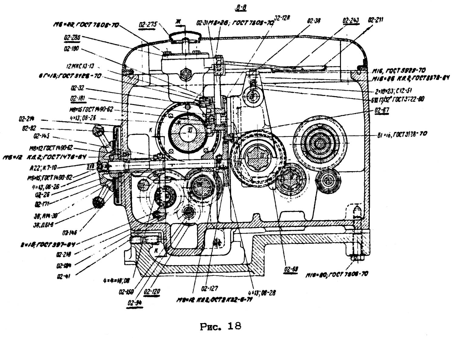 Передня бабка . На рис. 10 показано передню бабку з коробкою швидкостей. Обертання від головного електродвигуна передається веденому шківу, що сидить на валу I. Цей вал несе реверсивну фрикційну муфту, від якої рух на вал II передається або через блок z = 56-z = 51, або через колесо z = 50 і проміжний блок z = 24 -z = 36, що сидить на консольній осі. З валу II на вал III обертання передається через потрійний блок z = 47-z = 55-z = 38. У лівому положенні блоку г = 43-г = 52, що сидить на шпинделі, рух з валу III передається на шпиндель безпосередньо через колеса z = 65-z = 43, а правому положенні цього блоку - через перебір, встановлений на валах IV і V. Всі вали обертаються на опорах кочення, які змащуються як розбризкуванням, так як коробка швидкостей залита маслом, так і примусово - за допомогою насоса . Рух подачі від шпинделя VI передається валу VII трензеля і далі механізм подач.
