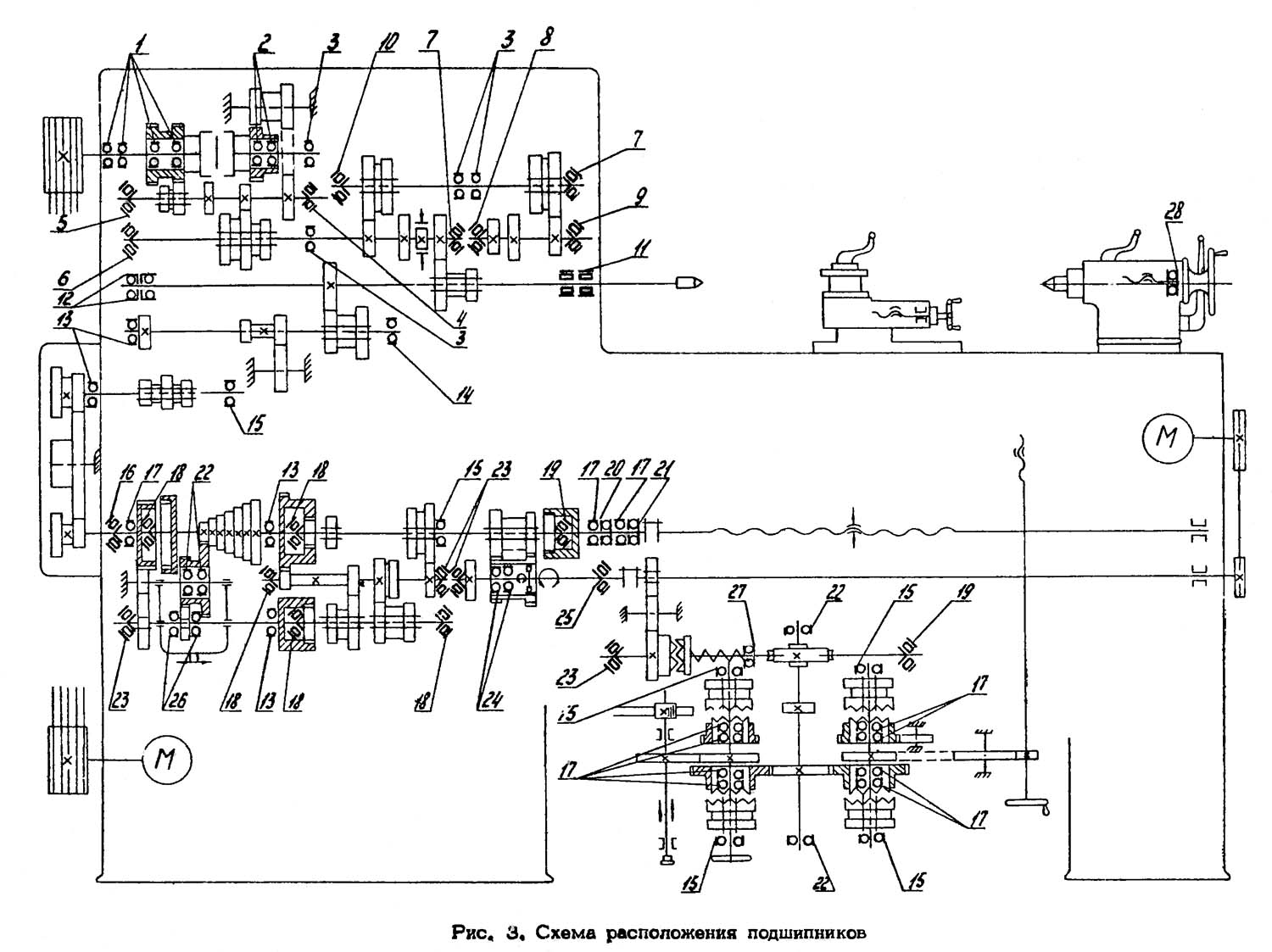 Схема розташування підшипників токарно-гвинторізного верстата 1к62. Дивитись у збільшеному масштабі