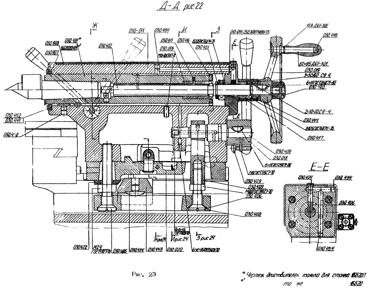 Шпиндель (пиноль) задньої бабки 7 представляет собой пустотелый цилиндр, передний край которого выполнен в виде конуса Морзе в который вставляется центр 6 или сверло, а в задний — гайка 9. При помощи етой гайки і гвинта 8 з маховиком 10 шпиндель може передвигаться вдоль оси. Шпонка 5 предохраняет шпиндель от поворота. Шпиндель зажимается рукояткой, которая имеет на кінці правую і левую нарезки для зажимных сухарей. При убирании шпинделя полностью в заднюю бабку винт 8 своим торцом упирается в торец центра 6 і выталкивает его из корпуса шпинделя. Таким образом, в етой конструкції выбивание центра из конуса очень удобно.