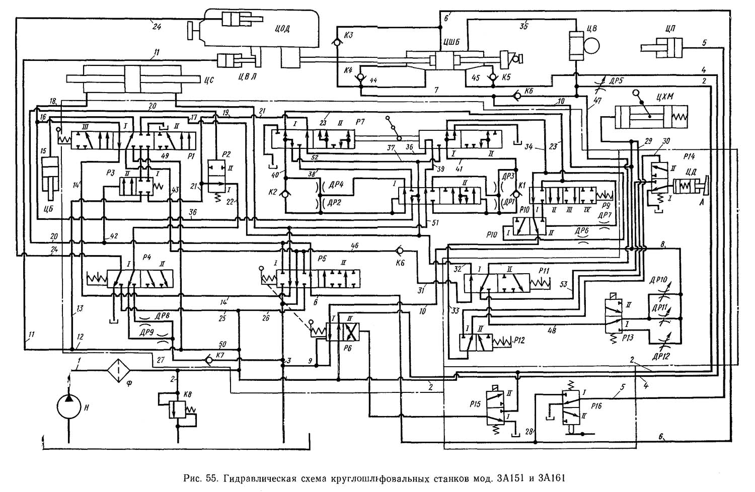 У гідропривід верстатів 3а151, 3а161 входять насос пластинчастого типу Н, гідроциліндри: переміщення столу ЦС, відведення пінолі ЦП, механізму блокування ЦБ, шліфувальної бабки ЦШБ, дозатора ЦД, вибірки люфтів (усунення зазорів) ЦВЛ, осциллуючого. Гідравлічна схема круглошліфувальних верстатів мод. 3а151 та 3а161 показана на рис. 55.